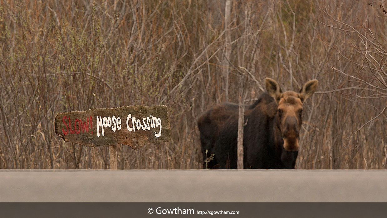 I guess 10 years was long enough wait to see a moose or so thought Mother Nature and she decided to lead me on this serendipitous ride: cancelled wedding shoot that kept me in the area, camera mounted with lens rented for the said wedding, detour from the initially planned route [with dear friend Bryant Weathers (@BryantWeathers)] that took me around Pequaming/Aura township, a severely damaged back road that prevented me from visiting another waterfall and a yooper traffic jam on L’Anse-Skanee road that slowed the drive down to a halt – all resulting in witnessing this moose in the wild, let alone with the Moose Crossing sign in front of it – a surreal experience that’s pretty hard to phrase into words!