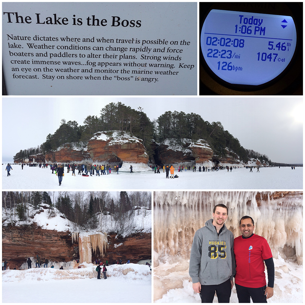 All along the skeptic in me was slightly worried and wondering as to how the frozen lake would support that many people (about 3,300 registered). Any such skepticism or worry disappeared as soon as we were able to drive across the very same frozen Lake Superior over an ice bridge to the aforementioned Madeline Island and back. The drive each way was a hair over 2 miles and took about 8 minutes. With the number of cars, bikers, skiers and snowmobilers that we saw during our drive, it seemed like any other regular icy road. If it could support 25-30 cars, each weighing anywhere between 1500-2000 lbs for as long as it had, I knew it would easily support 3000 some people for a little over 3 hours.