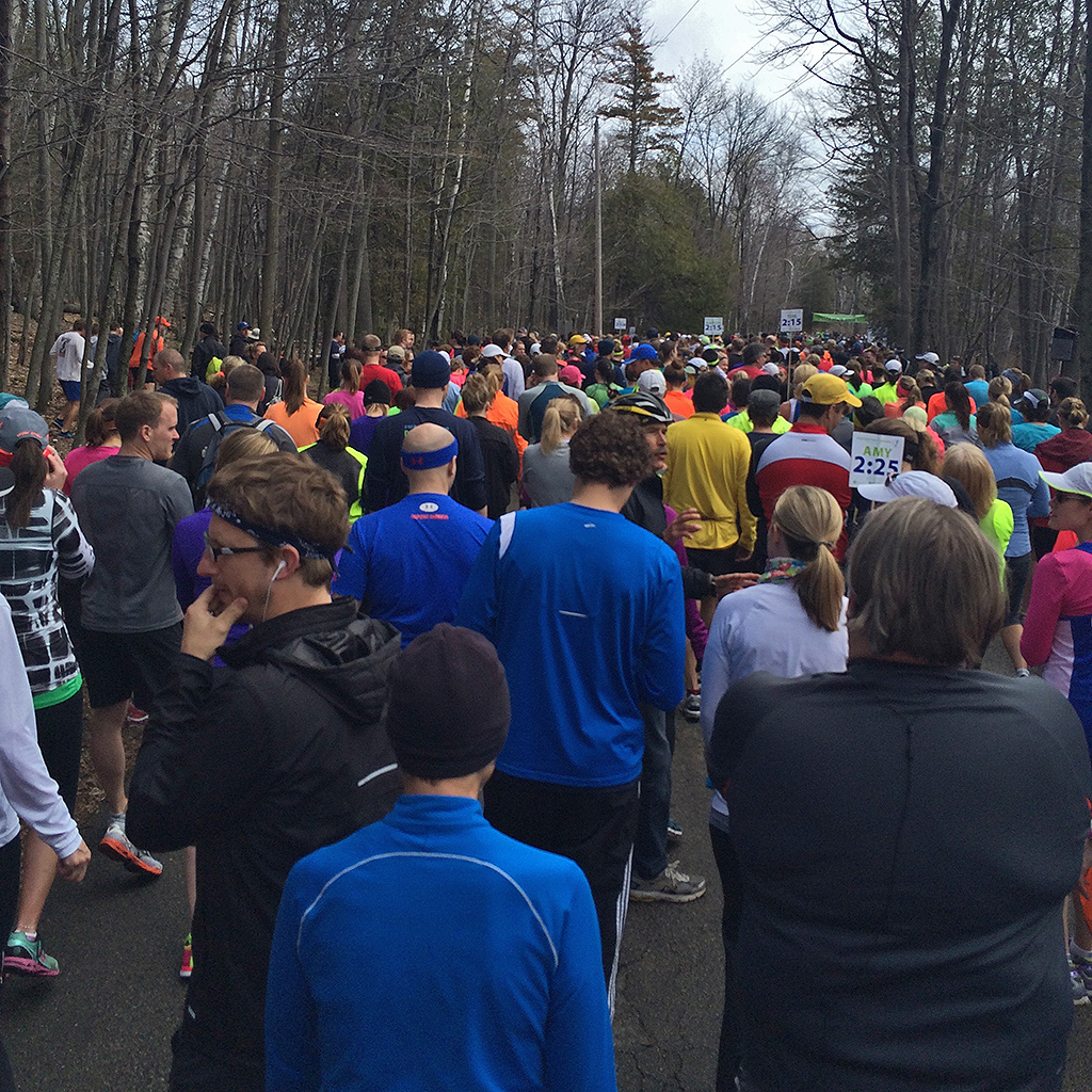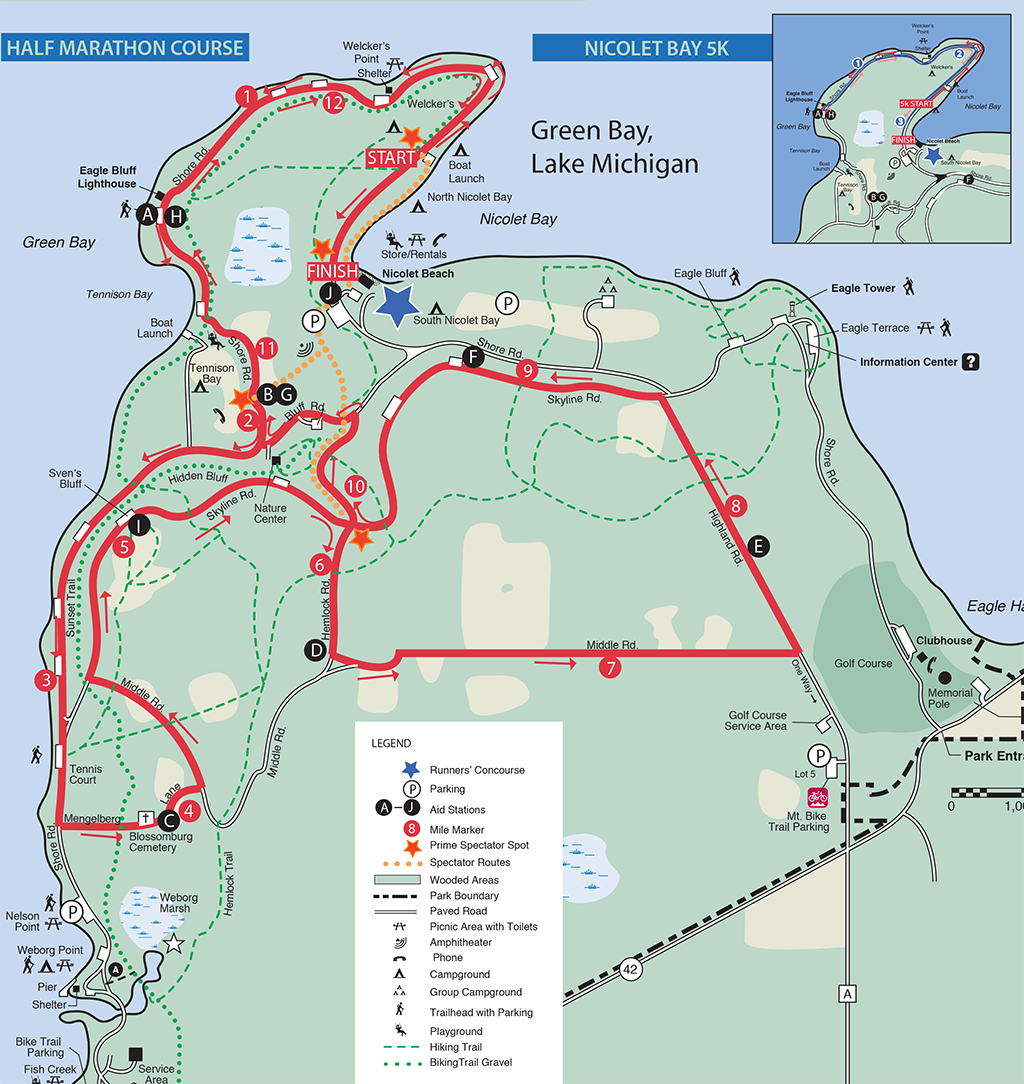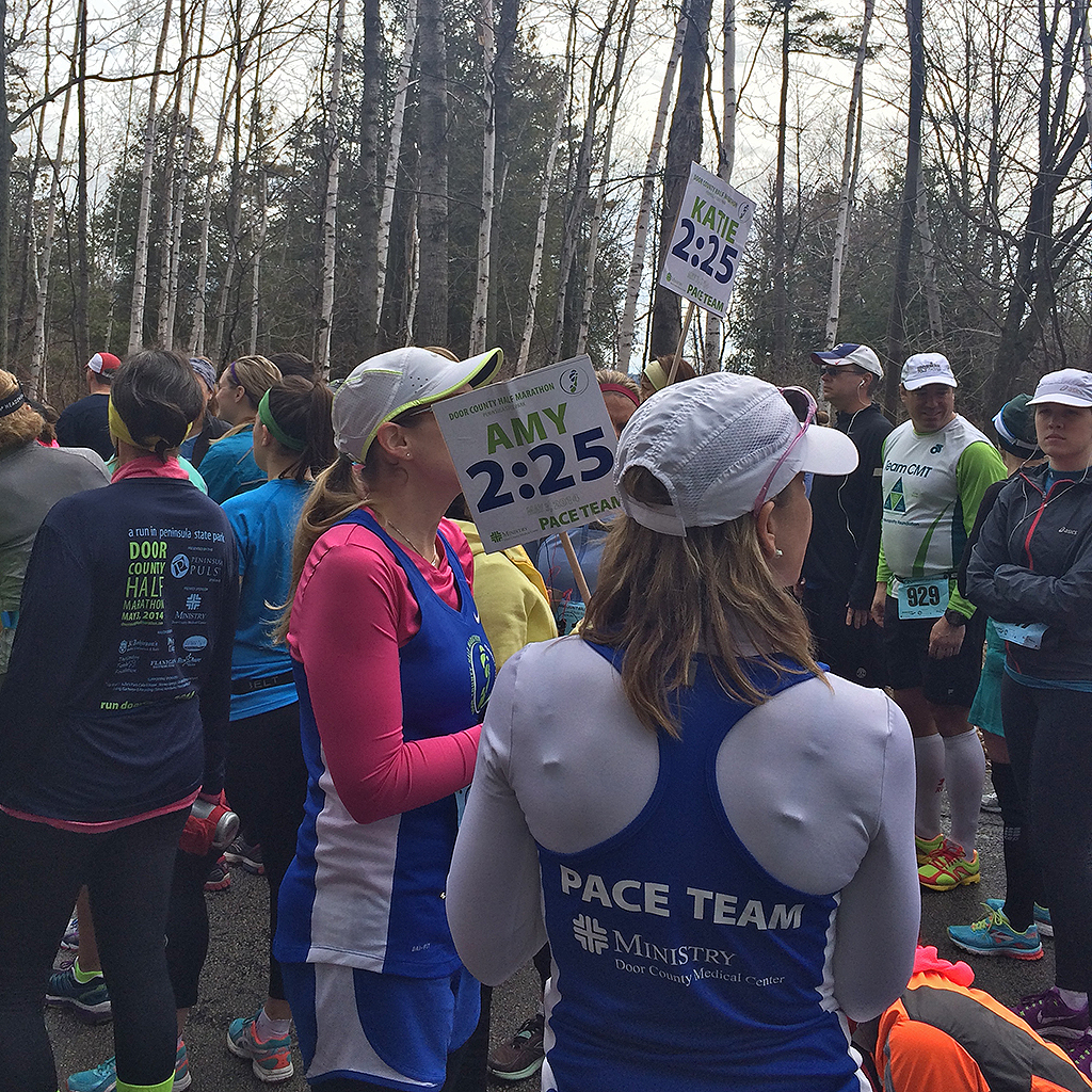 Having eaten well at the Pasquale’s International Cafe and rested well the night before in the cozy confines of dear friend Sarah‘s home, I left De Pere around 7 am towards the Peninsula State Park. The drive, as expected, was slow and took a little over 90 minutes. Fortunately, it didn’t take too long to find my friends well before the start time — Amber, Alicia, Doug, Angela and Tony — in a crowd of 3000 or more, giving us an opportunity to catch up on each other’s lives. It was by far the most festive atmosphere for the start of any of the half marathons I have been a part of: a beautiful rendition of America, the beautiful was followed by a very joyous, energy filled, and music pumping start to the race. I chose to follow the 2:25 pace team (Amy and Katie, the pacers) and it took at least couple miles before I wasn’t rubbing shoulders with fellow runners.