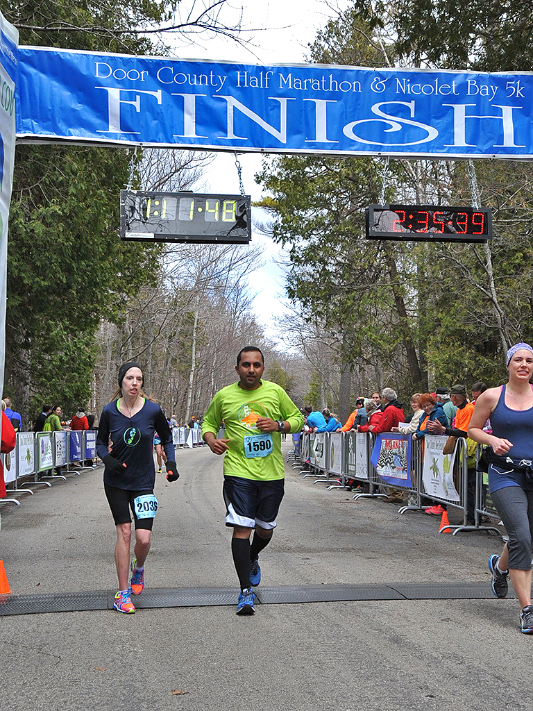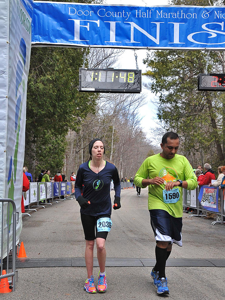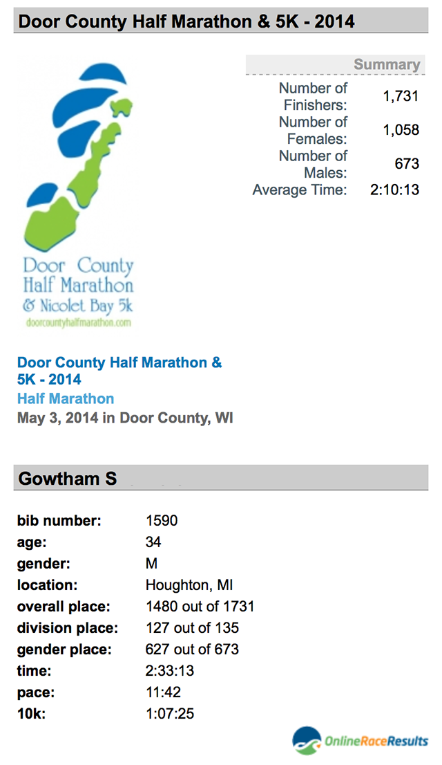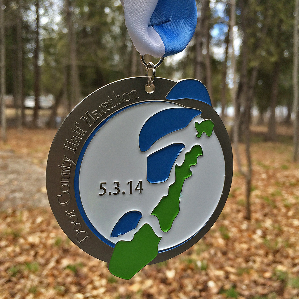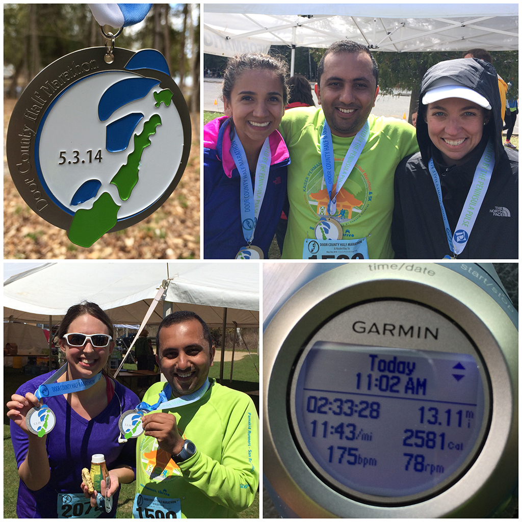 Given how much I love the varied ambience of Door County (Wisconsin), and how much fun it was to get a personal tour driving through — albeit for a short time the only time — with a dear friend‘s dad, and remembering the attractive race bling that my buddy Nils had earned in 2011 (remember, registration for this race happened in 2013 — when I was still immature enough to run for the bling and hadn’t made up mind to run better myself instead), it didn’t take too much thinking on my part to pick the Door County Half Marathon (over Cellcom Green Bay Half Marathon) from a list of events Alicia offered. Temperatures in March and April weren’t anything that I hadn’t or wouldn’t run outside in. But various interesting projects lead to almost non-existent training in much of March. Most of the runs over last 2-3 weeks included a speed/interval training concept taught by a dear friend, Rob Larson.