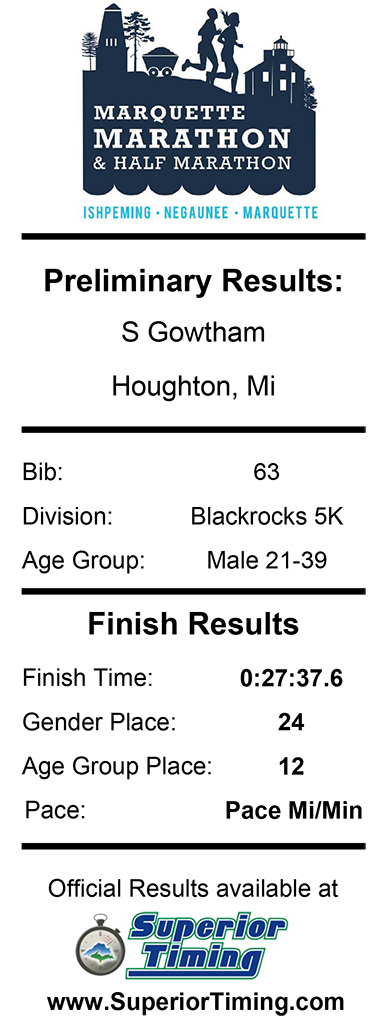 Event started at 7:30 pm on Friday night from the Marquette Commons, and though I had thought about the potential for breaking the 5k PR (of 27:35 set in 2009 edition of Lake Linden 5k) the comfortable pace at which I started the run showed little to no indication that I had any chance of coming anywhere close to 27:35. It wasn’t until mile marker #1, when my Garmin beeped, that I realized I was running sub 8:30 min/mile pace. With plenty of gas still left in the tank and not sensing any uncomforted, I kept about the same pace and Garmin beeped to indicate sub 8:45 min/mile pace. It was only then that I thought I had a shot at surpassing 27:35 at the finish line. A little bit of mental math suggested a 9:00 min/mile pace would get me there. There was quite the disappointment as soon as I crossed the finish line for the timer indicated 27:36 — missing the PR by a mere one second.