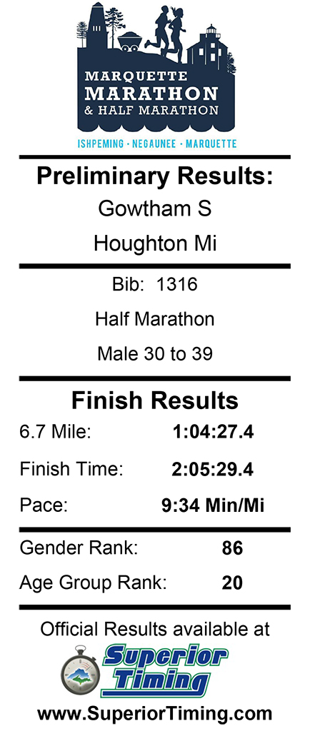 I don’t have a specific reason or a story as to why I signed up for this race in early July, except that I was looking for half marathon events to get the count up to ten, and I wished to keep as many such events in the Yoop as possible. Marquette Marathon, not too far from being a home area event, seemed to satisfy all such requirements with the added bonus of a new point to point — mostly downhill — course, making it a very good candidate to test my legs in different conditions and potentially earn a new PR.