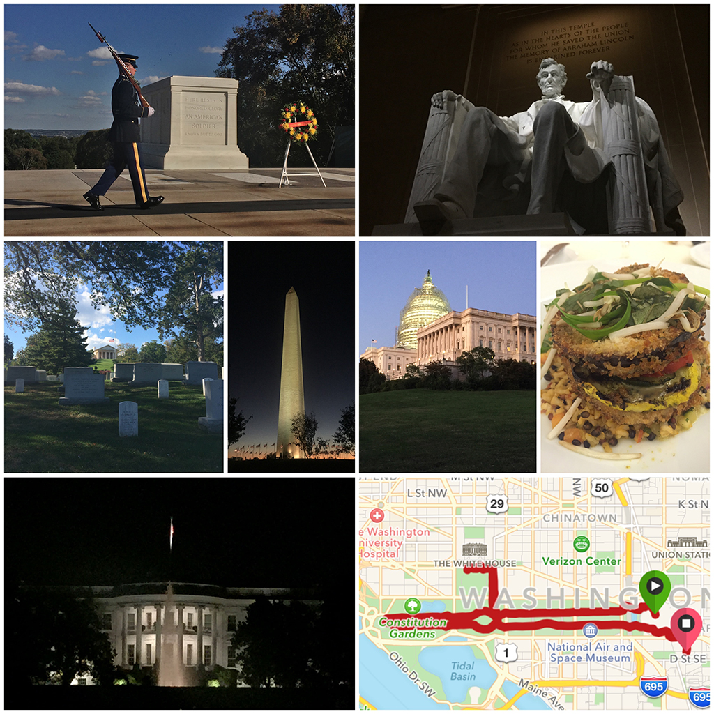 | 08 | 2015-10-16 6:53 pm | Washington, DC, Quick Run (1/10) 6.37 mi, 0:55:57, 8:47 min/mile, 6.83 mph, 163 bpm, 673 61 F, 6 mph NW, felt like 61 F, 39% humidity; mostly clear and very pleasant |