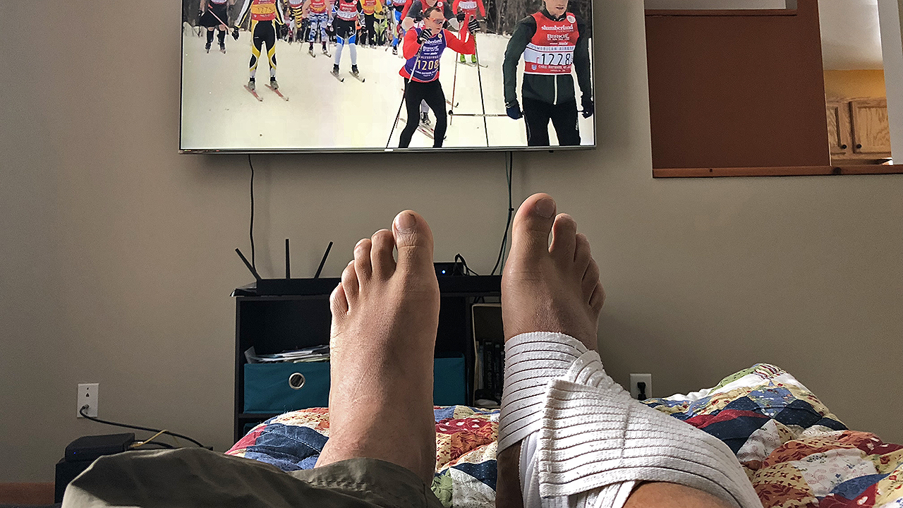 The race week got off on the right foot, quite literally. I had completed what was going to be the last long ski on Saturday in Swedetown Trails and I had fallen only once. It (i.e., the falling) wasn’t anything I hadn’t done countably infinite times before and nothing hurt that day or for the next 16-18 hours. But when I woke up on Sunday morning, there was a noticeable pain in my right ankle growing upwards on the outer side towards the knee and gradually increasing in intensity as the day grew. Pain, by Sunday night and through Monday morning, was sharp enough that I couldn’t mimic the pull up/stride motion on a flat terrain … let alone for 29 km up and down some hills. This wasn’t something I expected or thought had sufficient time to fix before heading out of town on Thursday. Had it worsened and kept me from doing the Korte, I’d have chalked it up as