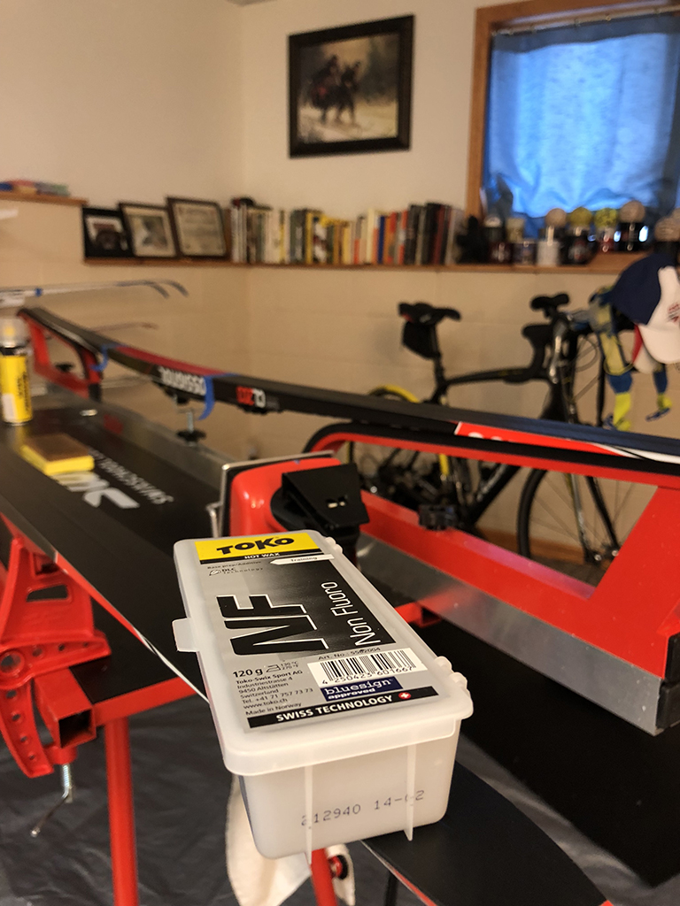 A layer of Black, two layers of Blue and one layer of Red (all from Toko and all NF) was the initial plan. While I did channel Mr. Miyagi (you know, to Wax on, Wax off), something changed somewhere along the way, and I ended up doing a layer of Black (Toko, NF), a layer of Blue (Toko, NF), a layer of Blue (Swix, CH6) and a layer of Red (Swix, CH8). I applied generous amounts of Skin Cleaner and some other transparent liquid also from Toko, and threw in a prayer for good measure at the end: please make the weather conditions on race day match my waxing make my skis hold up during the race.