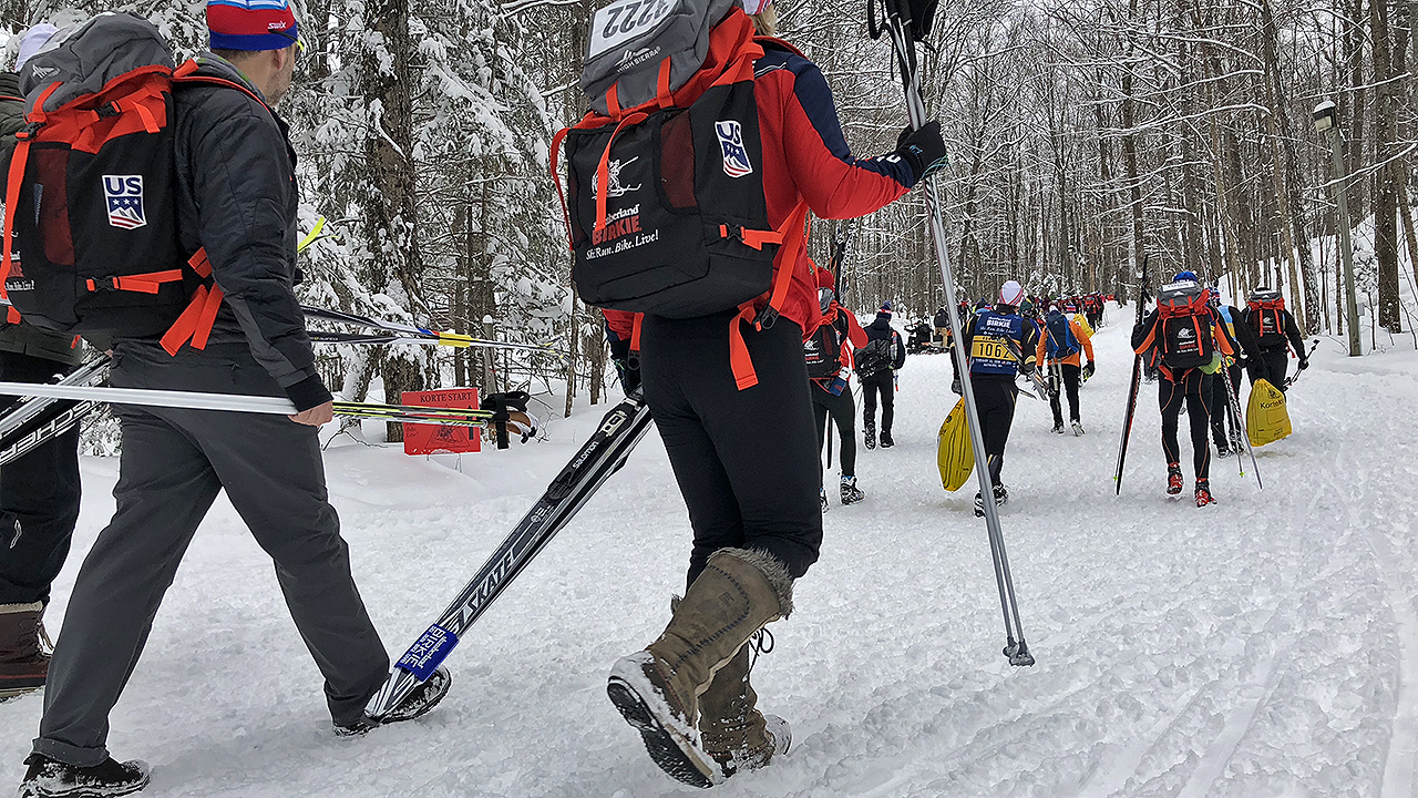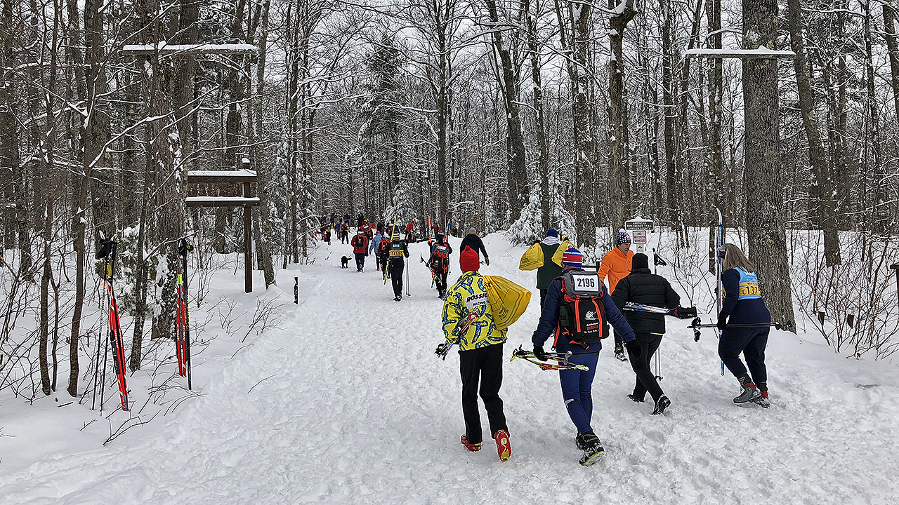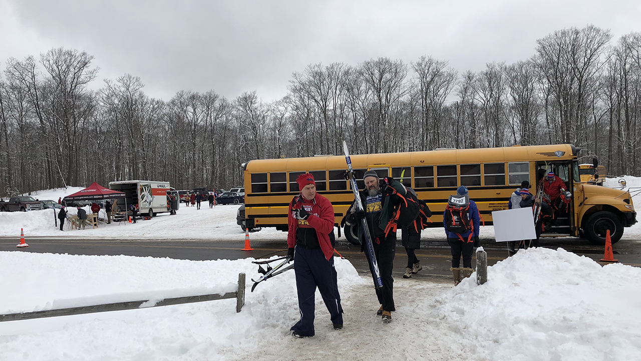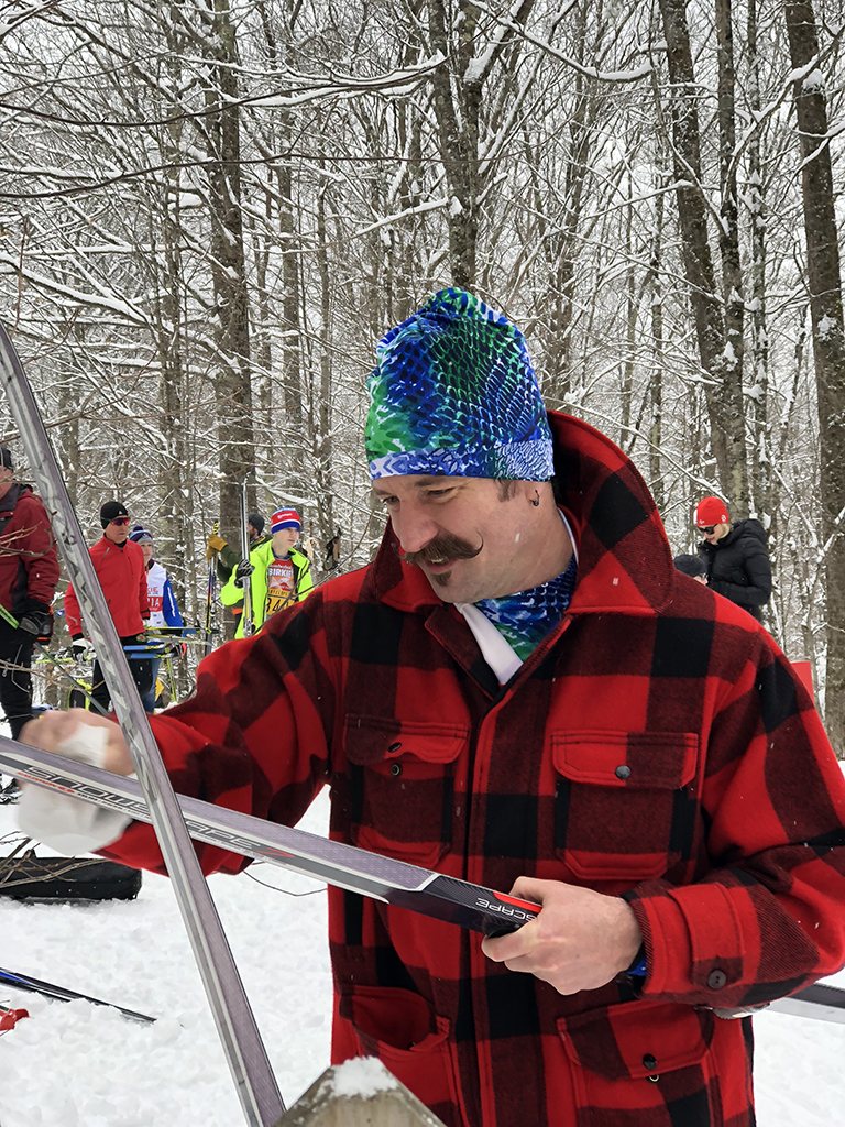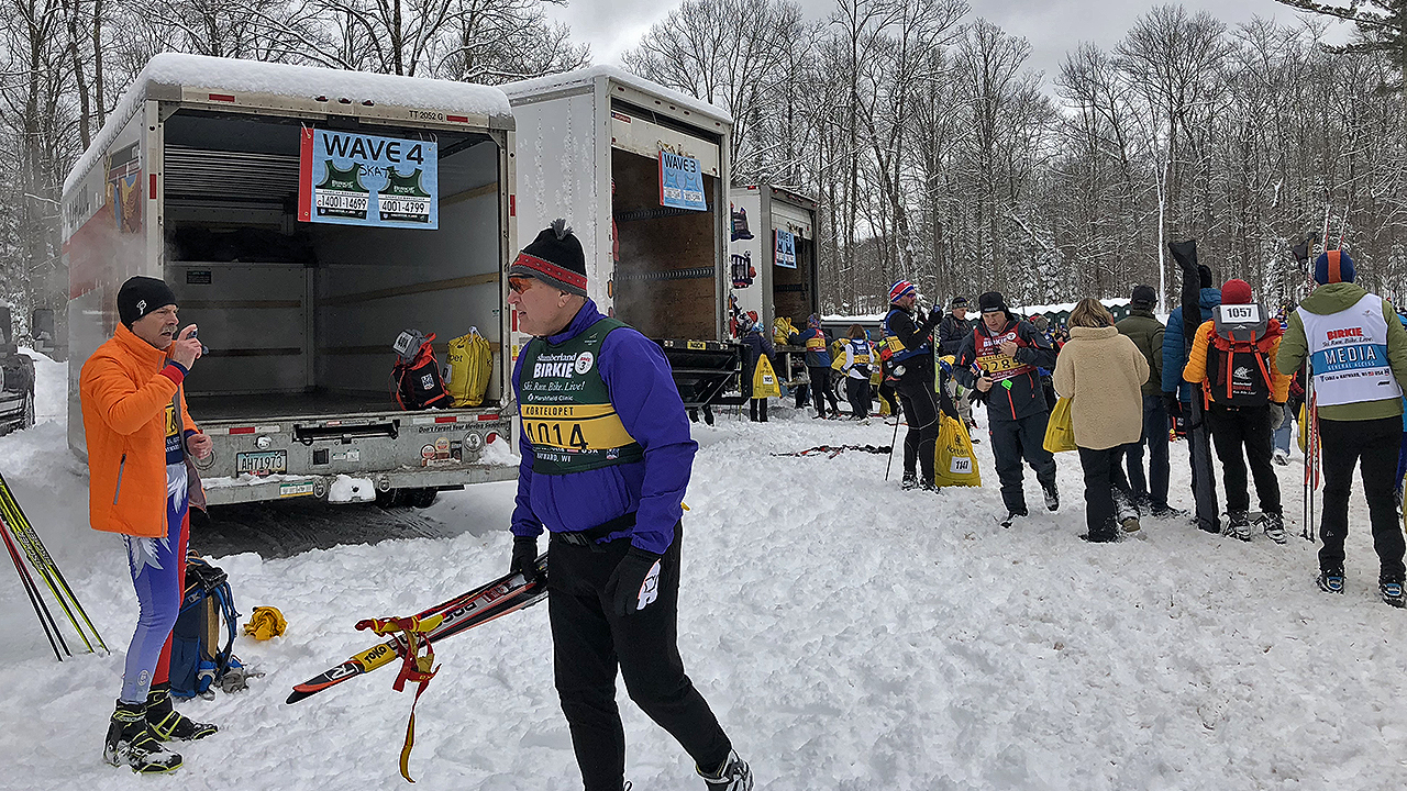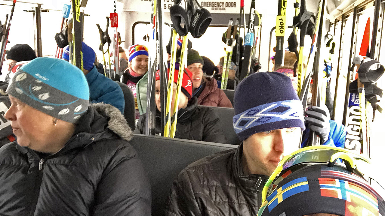 The line was long but was moving fairly quickly and it wasn’t without friendly faces. Kim Green, who was many faces ahead in the line, handed me a hand-made buff but warned that it might be too warm to wear it for the race. Any perceived delay in the timely arrival of empty buses to the parking lot was caused by (a) having just one parking lot, and (b) the buses having to use the same route as the cars coming to park or drop off the skiers. I am sure the event organizers will figure out a way to improve and implement a different solution within a year or two.