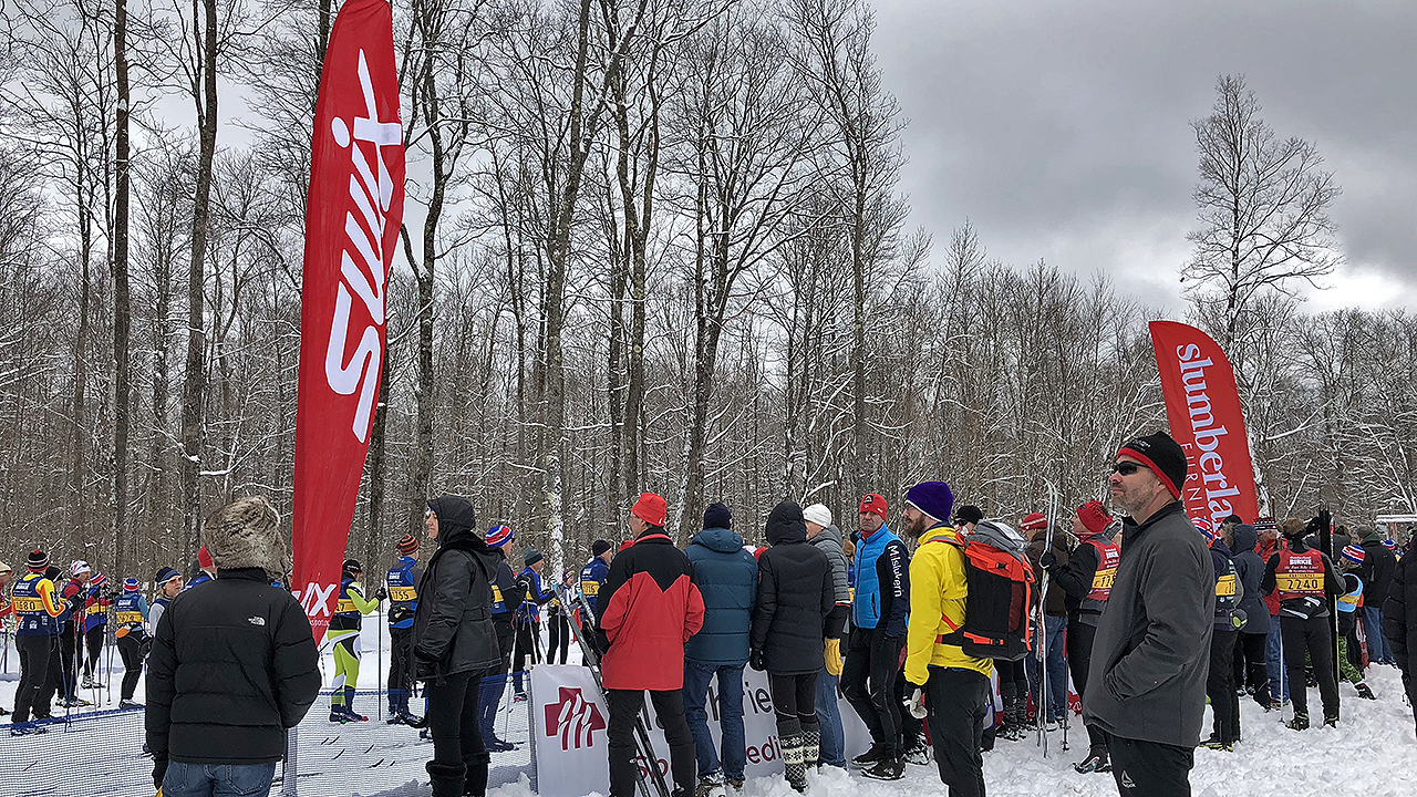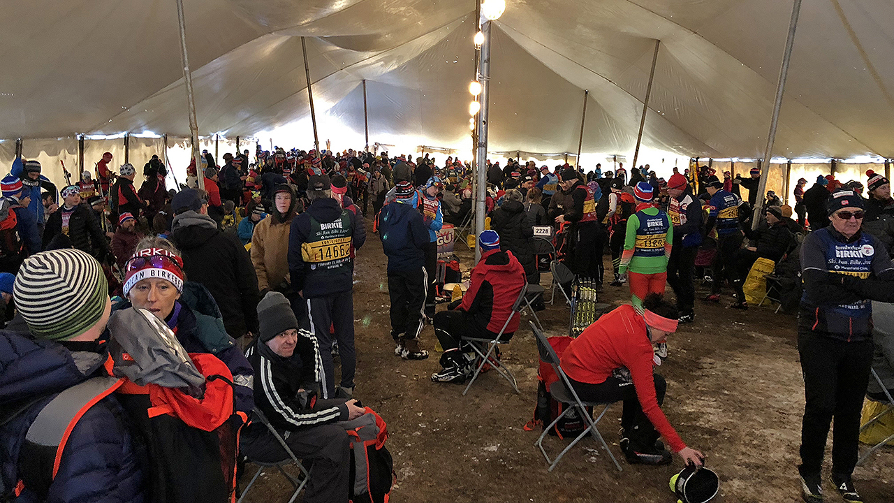 DJ and I got on a bus fairly quickly and made it the start with plenty time to spare – even for DJ’s Wave 2 start time. The imagination and impression I had of Birkie being a ski pilgrimage were playing out in real life as I made my way towards the start area. With snow-clad trees around, fresh powder underneath my feat and in the company of hundreds of (some cheerful and some stoic) skiers, I felt like I was walking into a picture postcard. It wouldn’t be the last time I’d have such a feeling that day either! The start area was very expansive and equally well laid out – trucks (one per wave) to bring the gear bags back to Hayward, plethora of porta-Johns and a very big warming tent. I had the opportunity to chat with several fellow skiers, some volunteers and staff (one of them being the crew chief) before it was time to get into the pen.