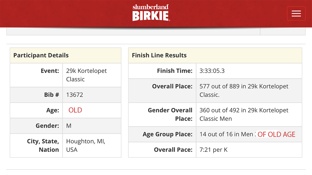 This is just life getting back at me. Last year, I didn’t train and was miraculously bailed out by lack of snow. This year, I train and there’s plenty snow but a mystical injury keeps me from doing it.