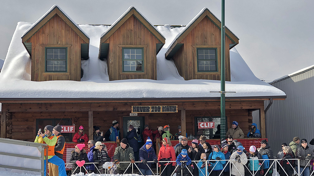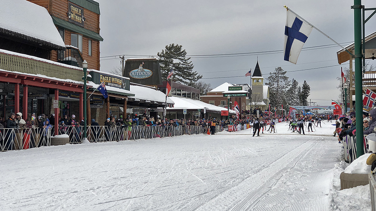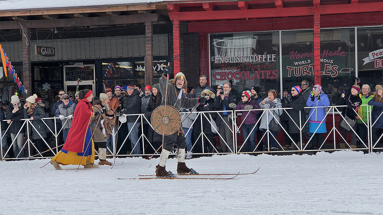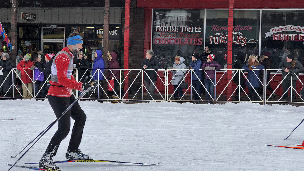 After a short break at the cabin, Andi, Christine and I headed downtown to catch a glimpse of elite skiers come through the Main Street. We were able to find a parking spot not too far away and had plenty of time to find a good spot (at the very bottom of the International Bridge) to watch. Kim and Greg Green joined us as well. It wasn’t long before we got to watch the first 100 or so elite skiers zip through the Main Street to the finish line.