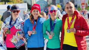 A message from MikeY was the first indication that I had done well and it took a while for me to look up the preliminary results (SuperiorTiming.com‘s website was expectedly busy with requests from many skiers and their families). Another message indicated that Christine, Kim and Shannon were done with their races and were waiting for me at Contrast Coffee. A warm beverage therefrom felt like someone was hugging me from the inside! We all walked back to the post-race festivities area where the organizers provided a yummy and filling pasty!! While waiting for the preliminary results to become official (because there were multiple waves), I got a chance to catch up with a majority of the Keweenaw contingent (Shawn couldn’t travel to this event and she was missed), and friends – Jenna, Scott and Zach – from the other side of the Cheese Curtain. Once the results were officially official, my finish time of 1:23:56.7 turned out to be good for 15/97 overall, 11/57 in gender and 1/3 in my age group.