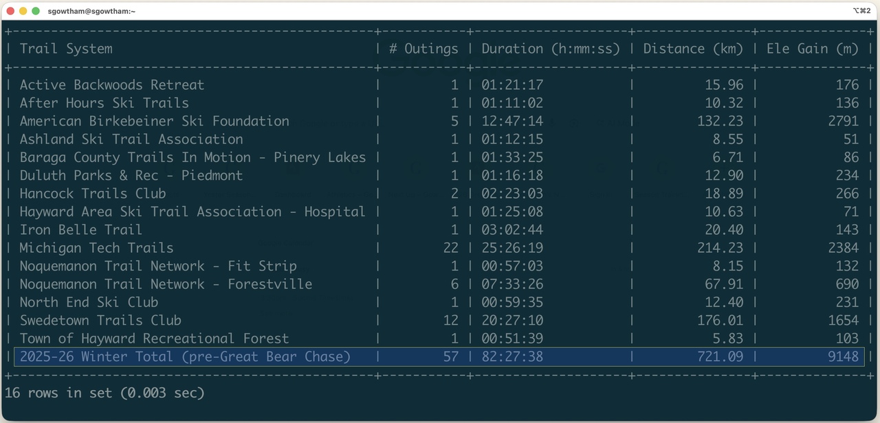 | 03 | 1.00 | 8:13 | 15↑ 17↓ | 0:20:53 | 6:57 | 0:46:00 | 8:22 - 30/20/30 F, 12 mph N, 99%, snow |