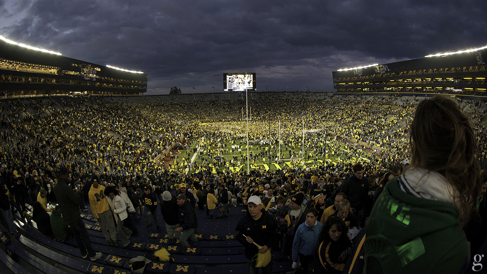 The Big House and the atmosphere inside during the game lived every bit up to its reputation and well surpassed my expectation. The greenest grass, yellowest yellow and bluest sky (albeit in patches) that I have ever seen in Ann Arbor in October; being one of 113,833 fans in attendance (third to biggest crowd ever recorded); near 100 dB noise level for almost every third down play (one must take into account that I was seated amongst the more mature crowd that didn’t necessarily yell at the top of their lungs all the time and that the stadium is very shallow unlike other shapes that would otherwise amplify the noise); the awesome performances by marching bands from both universities easily overshadowed the rather lack luster offensive production from either team [especially by the supposedly explosive DeNard Robinson: I’m neither an expert nor think I’m qualified to, by any stretch of wildest imagination, analyze football athletes. But few years of watching quality football on television, reading trustworthy books and having had the pleasure of hanging out with coaches & athletes alike (@DavidH51, @RealSteveShort, Bobby Slowik, @Philbrath, @HuskyPlowMan, et. al.) has taught me enough to see a play as it evolves in time. And trust me, shoe lace – with his general lack of game awareness & seeming unwillingness to exploit the situational opportunities even when they are presented on a silver platter – missed at least two golden opportunities that would have turned this nail biter into a no contest]; not a drop of rain on a day that had plenty of it in its forecast, and when the game clock could tick down no more, Wolverines added yet another feather (900 wins in their hallowed program, first ever to do so) in their hat of seemingly endless feathers of accomplishments & in turn, earning the right to keep The Paul Bunyan Trophy for a year … are just some of the things I could find words to articulate my experience.