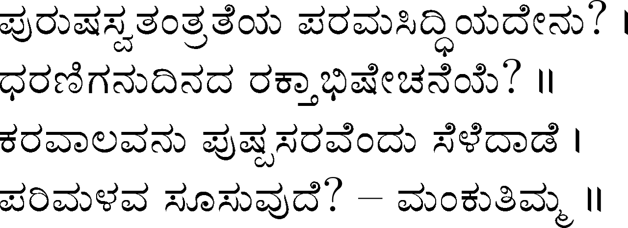 Devanahalli Venkataramanaiah Gundappa - better known as D V Gundappa or better yet just by his initials, DVG - was a writer and philosopher and a stalwart of Kannada (one of the south Indian languages) literature. While he authored numerous works - Antahpura Geete, Umarana Osage, Jnaapaka Chitra Shaale, Jeevana Dharma Yoga, MaruLa Muniyana Kagga, Samskruti, Vasanta Kusumaanjali and more, I believe that Mankutimmana Kagga (loose translation: Dim Tim's Rigmarole) stands out as being most familiar to the masses. Published in 1943, Mankutimmana Kagga (or just Kagga) is a collection of 945 standalone 4-line poems (i.e., muktaka) that conform to a specific grammar rule (i.e., aadipraasa - the second letter in every sentence of a given poem is the same or its variant). Their elegance and beauty, to me anyway, is that the scope of their meaning and one's understanding in turn seem to grow with one's experiences in life.