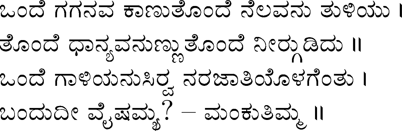 Devanahalli Venkataramanaiah Gundappa - better known as D V Gundappa or better yet just by his initials, DVG - was a writer and philosopher and a stalwart of Kannada (one of the south Indian languages) literature. While he authored numerous works - Antahpura Geete, Umarana Osage, Jnaapaka Chitra Shaale, Jeevana Dharma Yoga, MaruLa Muniyana Kagga, Samskruti, Vasanta Kusumaanjali and more, I believe that Mankutimmana Kagga (loose translation: Dim Tim's Rigmarole) stands out as being most familiar to the masses. Published in 1943, Mankutimmana Kagga (or just Kagga) is a collection of 945 standalone 4-line poems (i.e., muktaka) that conform to a specific grammar rule (i.e., aadipraasa - the second letter in every sentence of a given poem is the same or its variant). Their elegance and beauty, to me anyway, is that the scope of their meaning and one's understanding in turn seem to grow with one's experiences in life.