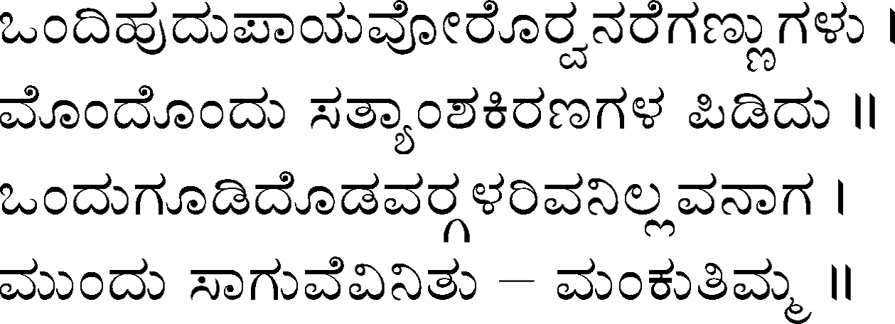 Devanahalli Venkataramanaiah Gundappa - better known as D V Gundappa or better yet just by his initials, DVG - was a writer and philosopher and a stalwart of Kannada (one of the south Indian languages) literature. While he authored numerous works - Antahpura Geete, Umarana Osage, Jnaapaka Chitra Shaale, Jeevana Dharma Yoga, MaruLa Muniyana Kagga, Samskruti, Vasanta Kusumaanjali and more, I believe that Mankutimmana Kagga (loose translation: Dim Tim's Rigmarole) stands out as being most familiar to the masses. Published in 1943, Mankutimmana Kagga (or just Kagga) is a collection of 945 standalone 4-line poems (i.e., muktaka) that conform to a specific grammar rule (i.e., aadipraasa - the second letter in every sentence of a given poem is the same or its variant). Their elegance and beauty, to me anyway, is that the scope of their meaning and one's understanding in turn seem to grow with one's experiences in life.