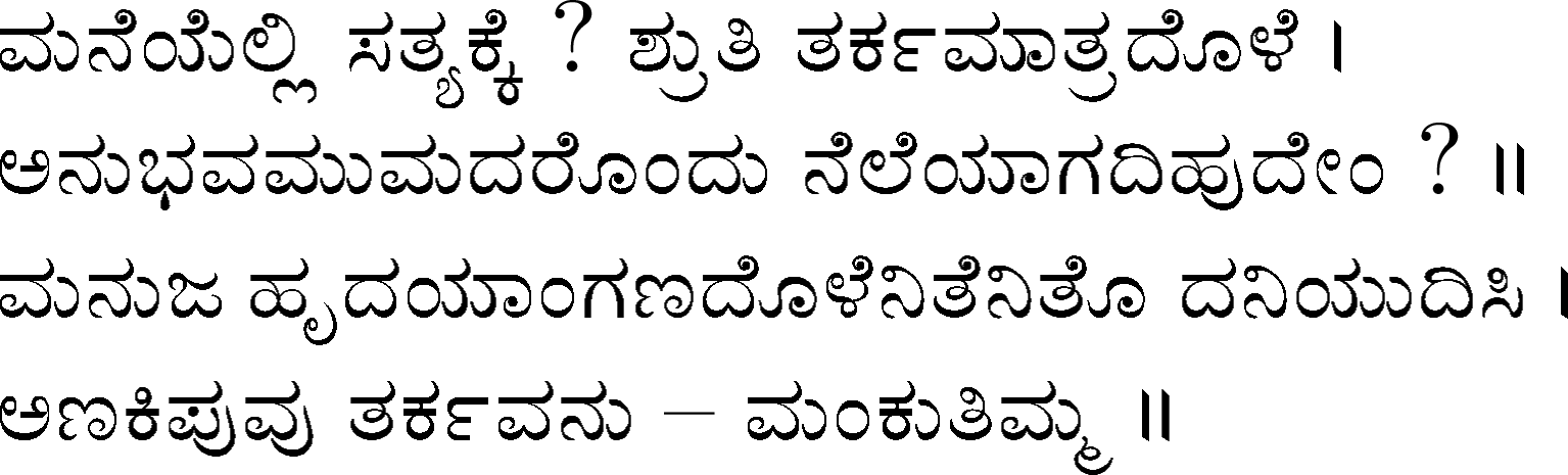 Being a fan of DVG's work, specifically of Kagga, I was then looking for an online resource to periodically review various verses. Not finding any and realizing that the support for rendering Kannada font in web browsers was minimal to non-existent, I combined the two projects - rendering LaTeX expressions as graphics and typesetting Kannada in LaTeX - to typeset, compile and produce all 945 verses as web-friendly PNG images over the next few years. The project was completed and the final verse, #945, was published on 29th August 2010. Sometime in early December 2020, the project files were restored from an old SVN repository into GitHub, higher resolution images were generate using tex2im (Python utility) and incorporated into my journal with originally published dates.