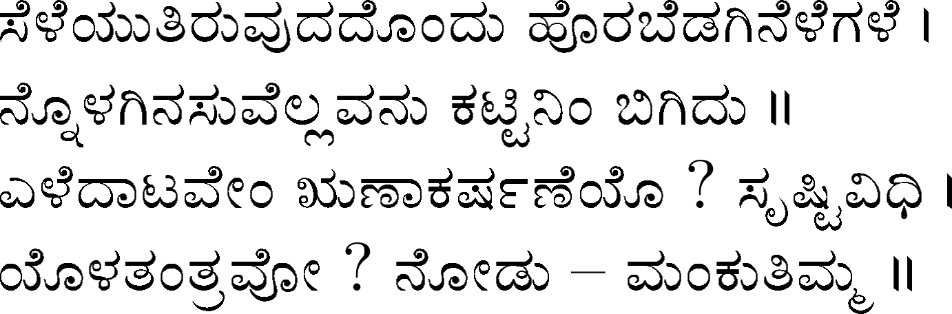 Being a fan of DVG's work, specifically of Kagga, I was then looking for an online resource to periodically review various verses. Not finding any and realizing that the support for rendering Kannada font in web browsers was minimal to non-existent, I combined the two projects - rendering LaTeX expressions as graphics and typesetting Kannada in LaTeX - to typeset, compile and produce all 945 verses as web-friendly PNG images over the next few years. The project was completed and the final verse, #945, was published on 29th August 2010. Sometime in early December 2020, the project files were restored from an old SVN repository into GitHub, higher resolution images were generate using tex2im (Python utility) and incorporated into my journal with originally published dates.