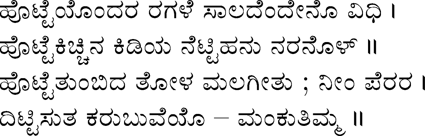 Devanahalli Venkataramanaiah Gundappa - better known as D V Gundappa or better yet just by his initials, DVG - was a writer and philosopher and a stalwart of Kannada (one of the south Indian languages) literature. While he authored numerous works - Antahpura Geete, Umarana Osage, Jnaapaka Chitra Shaale, Jeevana Dharma Yoga, MaruLa Muniyana Kagga, Samskruti, Vasanta Kusumaanjali and more, I believe that Mankutimmana Kagga (loose translation: Dim Tim's Rigmarole) stands out as being most familiar to the masses. Published in 1943, Mankutimmana Kagga (or just Kagga) is a collection of 945 standalone 4-line poems (i.e., muktaka) that conform to a specific grammar rule (i.e., aadipraasa - the second letter in every sentence of a given poem is the same or its variant). Their elegance and beauty, to me anyway, is that the scope of their meaning and one's understanding in turn seem to grow with one's experiences in life.