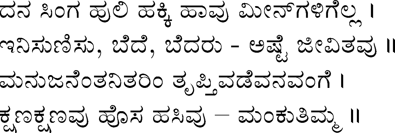 Devanahalli Venkataramanaiah Gundappa - better known as D V Gundappa or better yet just by his initials, DVG - was a writer and philosopher and a stalwart of Kannada (one of the south Indian languages) literature. While he authored numerous works - Antahpura Geete, Umarana Osage, Jnaapaka Chitra Shaale, Jeevana Dharma Yoga, MaruLa Muniyana Kagga, Samskruti, Vasanta Kusumaanjali and more, I believe that Mankutimmana Kagga (loose translation: Dim Tim's Rigmarole) stands out as being most familiar to the masses. Published in 1943, Mankutimmana Kagga (or just Kagga) is a collection of 945 standalone 4-line poems (i.e., muktaka) that conform to a specific grammar rule (i.e., aadipraasa - the second letter in every sentence of a given poem is the same or its variant). Their elegance and beauty, to me anyway, is that the scope of their meaning and one's understanding in turn seem to grow with one's experiences in life.