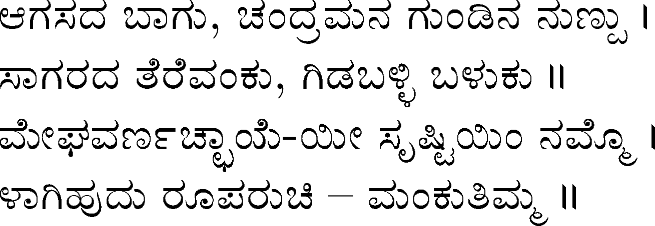 Devanahalli Venkataramanaiah Gundappa - better known as D V Gundappa or better yet just by his initials, DVG - was a writer and philosopher and a stalwart of Kannada (one of the south Indian languages) literature. While he authored numerous works - Antahpura Geete, Umarana Osage, Jnaapaka Chitra Shaale, Jeevana Dharma Yoga, MaruLa Muniyana Kagga, Samskruti, Vasanta Kusumaanjali and more, I believe that Mankutimmana Kagga (loose translation: Dim Tim's Rigmarole) stands out as being most familiar to the masses. Published in 1943, Mankutimmana Kagga (or just Kagga) is a collection of 945 standalone 4-line poems (i.e., muktaka) that conform to a specific grammar rule (i.e., aadipraasa - the second letter in every sentence of a given poem is the same or its variant). Their elegance and beauty, to me anyway, is that the scope of their meaning and one's understanding in turn seem to grow with one's experiences in life.