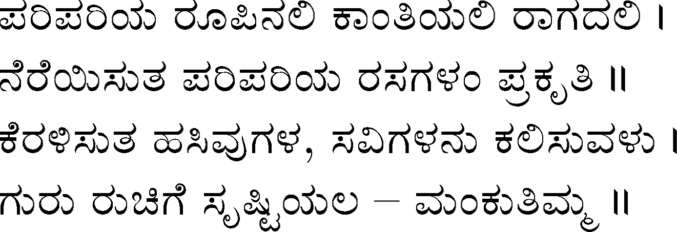 Being a fan of DVG's work, specifically of Kagga, I was then looking for an online resource to periodically review various verses. Not finding any and realizing that the support for rendering Kannada font in web browsers was minimal to non-existent, I combined the two projects - rendering LaTeX expressions as graphics and typesetting Kannada in LaTeX - to typeset, compile and produce all 945 verses as web-friendly PNG images over the next few years. The project was completed and the final verse, #945, was published on 29th August 2010. Sometime in early December 2020, the project files were restored from an old SVN repository into GitHub, higher resolution images were generate using tex2im (Python utility) and incorporated into my journal with originally published dates.