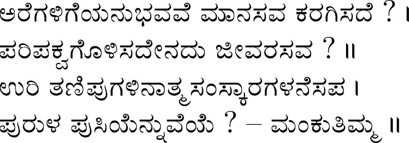 Devanahalli Venkataramanaiah Gundappa - better known as D V Gundappa or better yet just by his initials, DVG - was a writer and philosopher and a stalwart of Kannada (one of the south Indian languages) literature. While he authored numerous works - Antahpura Geete, Umarana Osage, Jnaapaka Chitra Shaale, Jeevana Dharma Yoga, MaruLa Muniyana Kagga, Samskruti, Vasanta Kusumaanjali and more, I believe that Mankutimmana Kagga (loose translation: Dim Tim's Rigmarole) stands out as being most familiar to the masses. Published in 1943, Mankutimmana Kagga (or just Kagga) is a collection of 945 standalone 4-line poems (i.e., muktaka) that conform to a specific grammar rule (i.e., aadipraasa - the second letter in every sentence of a given poem is the same or its variant). Their elegance and beauty, to me anyway, is that the scope of their meaning and one's understanding in turn seem to grow with one's experiences in life.