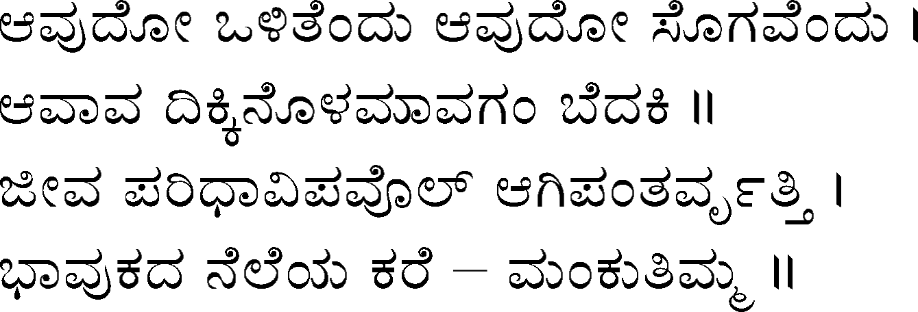 Devanahalli Venkataramanaiah Gundappa - better known as D V Gundappa or better yet just by his initials, DVG - was a writer and philosopher and a stalwart of Kannada (one of the south Indian languages) literature. While he authored numerous works - Antahpura Geete, Umarana Osage, Jnaapaka Chitra Shaale, Jeevana Dharma Yoga, MaruLa Muniyana Kagga, Samskruti, Vasanta Kusumaanjali and more, I believe that Mankutimmana Kagga (loose translation: Dim Tim's Rigmarole) stands out as being most familiar to the masses. Published in 1943, Mankutimmana Kagga (or just Kagga) is a collection of 945 standalone 4-line poems (i.e., muktaka) that conform to a specific grammar rule (i.e., aadipraasa - the second letter in every sentence of a given poem is the same or its variant). Their elegance and beauty, to me anyway, is that the scope of their meaning and one's understanding in turn seem to grow with one's experiences in life.