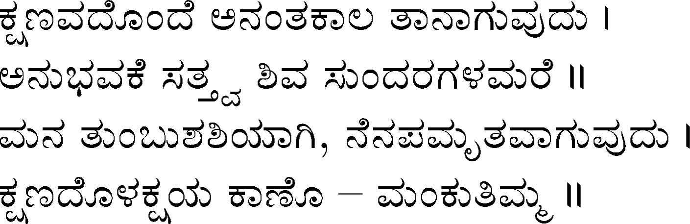 Being a fan of DVG's work, specifically of Kagga, I was then looking for an online resource to periodically review various verses. Not finding any and realizing that the support for rendering Kannada font in web browsers was minimal to non-existent, I combined the two projects - rendering LaTeX expressions as graphics and typesetting Kannada in LaTeX - to typeset, compile and produce all 945 verses as web-friendly PNG images over the next few years. The project was completed and the final verse, #945, was published on 29th August 2010. Sometime in early December 2020, the project files were restored from an old SVN repository into GitHub, higher resolution images were generate using tex2im (Python utility) and incorporated into my journal with originally published dates.