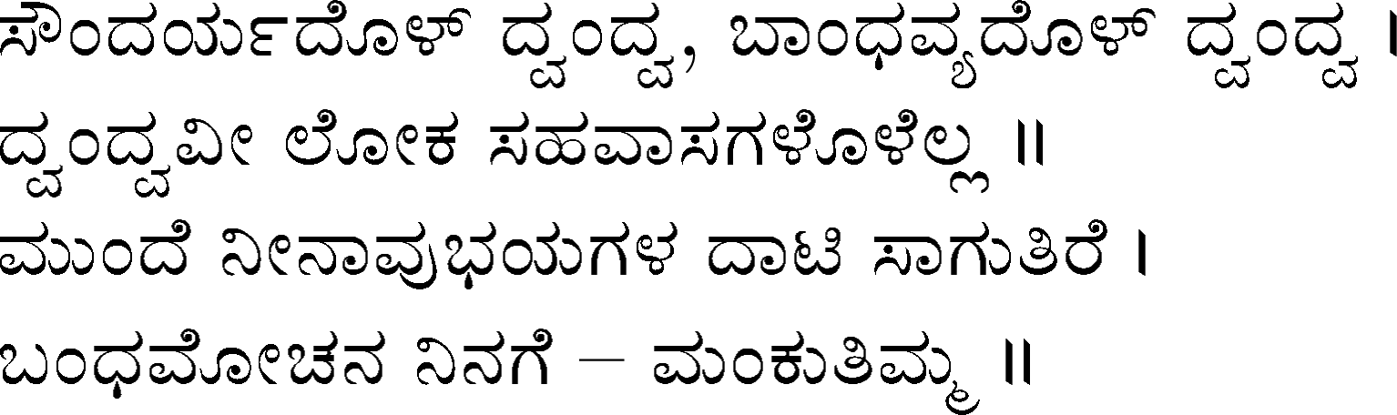 Devanahalli Venkataramanaiah Gundappa - better known as D V Gundappa or better yet just by his initials, DVG - was a writer and philosopher and a stalwart of Kannada (one of the south Indian languages) literature. While he authored numerous works - Antahpura Geete, Umarana Osage, Jnaapaka Chitra Shaale, Jeevana Dharma Yoga, MaruLa Muniyana Kagga, Samskruti, Vasanta Kusumaanjali and more, I believe that Mankutimmana Kagga (loose translation: Dim Tim's Rigmarole) stands out as being most familiar to the masses. Published in 1943, Mankutimmana Kagga (or just Kagga) is a collection of 945 standalone 4-line poems (i.e., muktaka) that conform to a specific grammar rule (i.e., aadipraasa - the second letter in every sentence of a given poem is the same or its variant). Their elegance and beauty, to me anyway, is that the scope of their meaning and one's understanding in turn seem to grow with one's experiences in life.