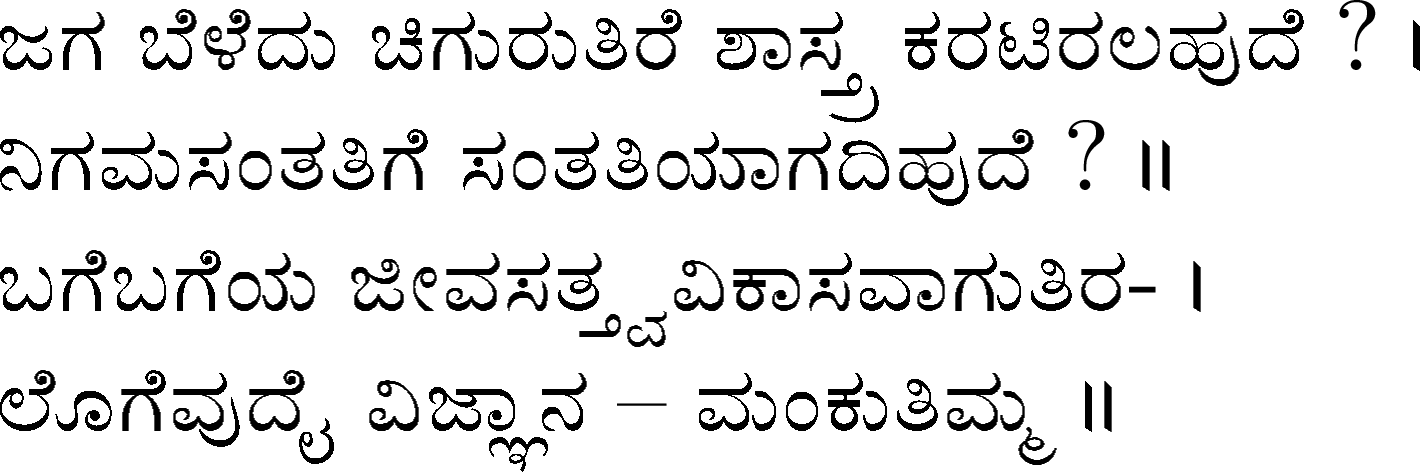 Devanahalli Venkataramanaiah Gundappa - better known as D V Gundappa or better yet just by his initials, DVG - was a writer and philosopher and a stalwart of Kannada (one of the south Indian languages) literature. While he authored numerous works - Antahpura Geete, Umarana Osage, Jnaapaka Chitra Shaale, Jeevana Dharma Yoga, MaruLa Muniyana Kagga, Samskruti, Vasanta Kusumaanjali and more, I believe that Mankutimmana Kagga (loose translation: Dim Tim's Rigmarole) stands out as being most familiar to the masses. Published in 1943, Mankutimmana Kagga (or just Kagga) is a collection of 945 standalone 4-line poems (i.e., muktaka) that conform to a specific grammar rule (i.e., aadipraasa - the second letter in every sentence of a given poem is the same or its variant). Their elegance and beauty, to me anyway, is that the scope of their meaning and one's understanding in turn seem to grow with one's experiences in life.