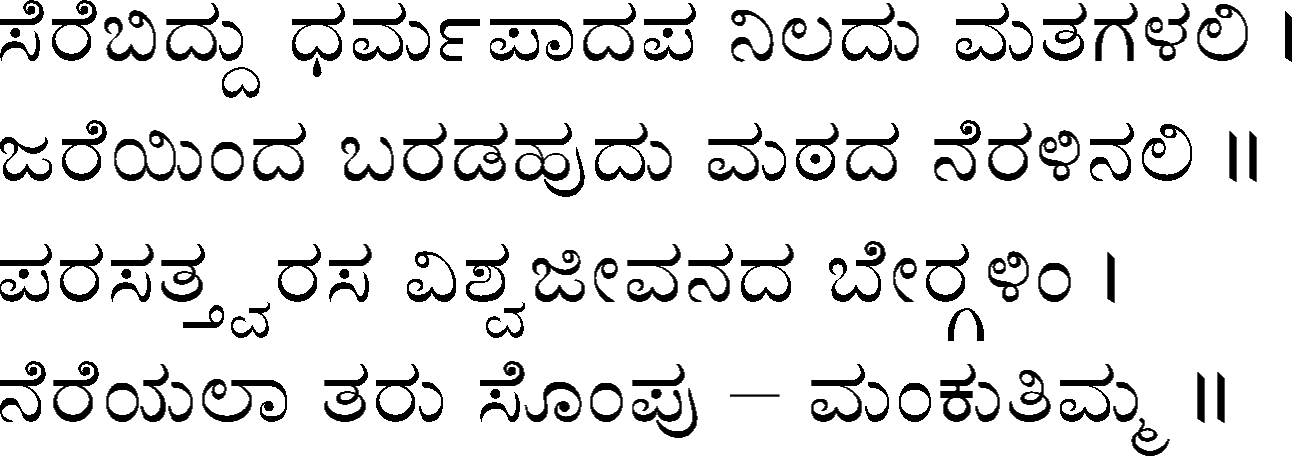 Devanahalli Venkataramanaiah Gundappa - better known as D V Gundappa or better yet just by his initials, DVG - was a writer and philosopher and a stalwart of Kannada (one of the south Indian languages) literature. While he authored numerous works - Antahpura Geete, Umarana Osage, Jnaapaka Chitra Shaale, Jeevana Dharma Yoga, MaruLa Muniyana Kagga, Samskruti, Vasanta Kusumaanjali and more, I believe that Mankutimmana Kagga (loose translation: Dim Tim's Rigmarole) stands out as being most familiar to the masses. Published in 1943, Mankutimmana Kagga (or just Kagga) is a collection of 945 standalone 4-line poems (i.e., muktaka) that conform to a specific grammar rule (i.e., aadipraasa - the second letter in every sentence of a given poem is the same or its variant). Their elegance and beauty, to me anyway, is that the scope of their meaning and one's understanding in turn seem to grow with one's experiences in life.