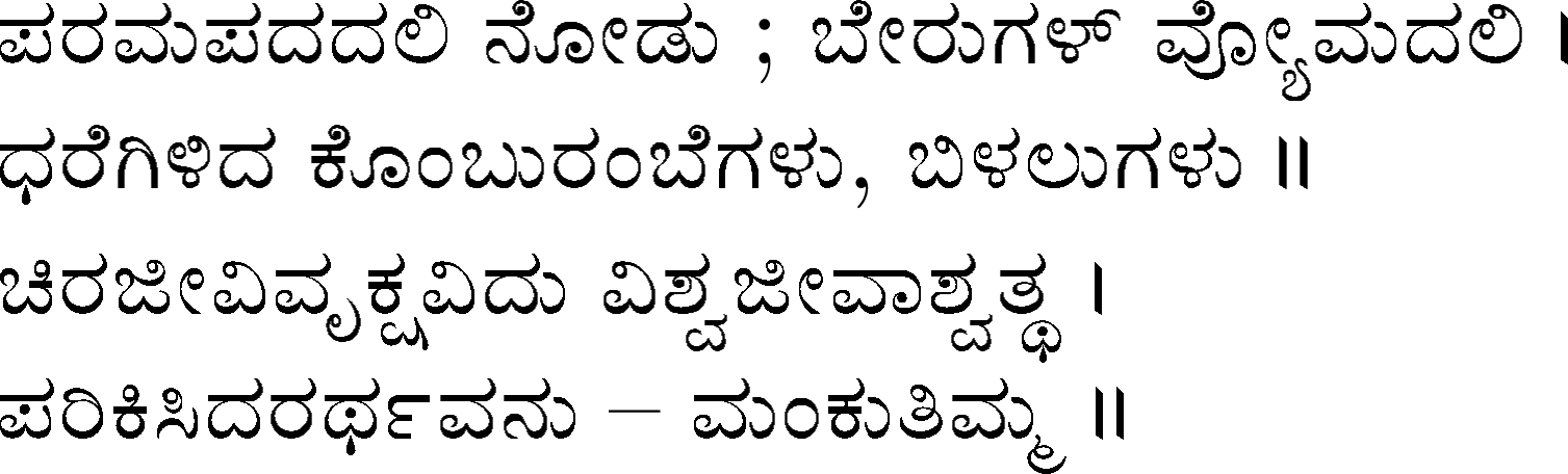 Devanahalli Venkataramanaiah Gundappa - better known as D V Gundappa or better yet just by his initials, DVG - was a writer and philosopher and a stalwart of Kannada (one of the south Indian languages) literature. While he authored numerous works - Antahpura Geete, Umarana Osage, Jnaapaka Chitra Shaale, Jeevana Dharma Yoga, MaruLa Muniyana Kagga, Samskruti, Vasanta Kusumaanjali and more, I believe that Mankutimmana Kagga (loose translation: Dim Tim's Rigmarole) stands out as being most familiar to the masses. Published in 1943, Mankutimmana Kagga (or just Kagga) is a collection of 945 standalone 4-line poems (i.e., muktaka) that conform to a specific grammar rule (i.e., aadipraasa - the second letter in every sentence of a given poem is the same or its variant). Their elegance and beauty, to me anyway, is that the scope of their meaning and one's understanding in turn seem to grow with one's experiences in life.