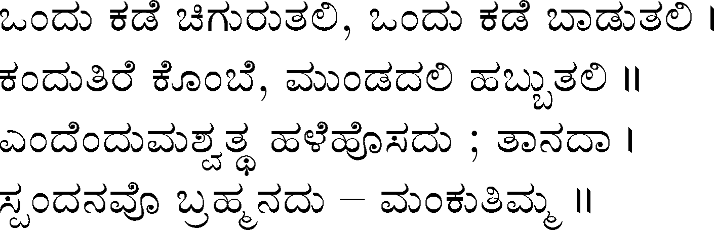 Devanahalli Venkataramanaiah Gundappa - better known as D V Gundappa or better yet just by his initials, DVG - was a writer and philosopher and a stalwart of Kannada (one of the south Indian languages) literature. While he authored numerous works - Antahpura Geete, Umarana Osage, Jnaapaka Chitra Shaale, Jeevana Dharma Yoga, MaruLa Muniyana Kagga, Samskruti, Vasanta Kusumaanjali and more, I believe that Mankutimmana Kagga (loose translation: Dim Tim's Rigmarole) stands out as being most familiar to the masses. Published in 1943, Mankutimmana Kagga (or just Kagga) is a collection of 945 standalone 4-line poems (i.e., muktaka) that conform to a specific grammar rule (i.e., aadipraasa - the second letter in every sentence of a given poem is the same or its variant). Their elegance and beauty, to me anyway, is that the scope of their meaning and one's understanding in turn seem to grow with one's experiences in life.