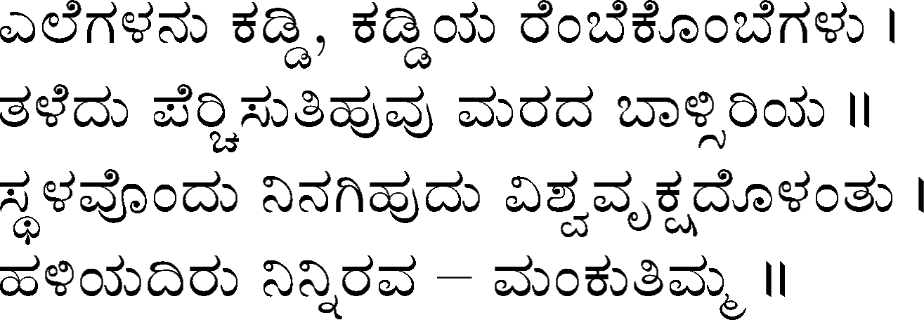 Devanahalli Venkataramanaiah Gundappa - better known as D V Gundappa or better yet just by his initials, DVG - was a writer and philosopher and a stalwart of Kannada (one of the south Indian languages) literature. While he authored numerous works - Antahpura Geete, Umarana Osage, Jnaapaka Chitra Shaale, Jeevana Dharma Yoga, MaruLa Muniyana Kagga, Samskruti, Vasanta Kusumaanjali and more, I believe that Mankutimmana Kagga (loose translation: Dim Tim's Rigmarole) stands out as being most familiar to the masses. Published in 1943, Mankutimmana Kagga (or just Kagga) is a collection of 945 standalone 4-line poems (i.e., muktaka) that conform to a specific grammar rule (i.e., aadipraasa - the second letter in every sentence of a given poem is the same or its variant). Their elegance and beauty, to me anyway, is that the scope of their meaning and one's understanding in turn seem to grow with one's experiences in life.