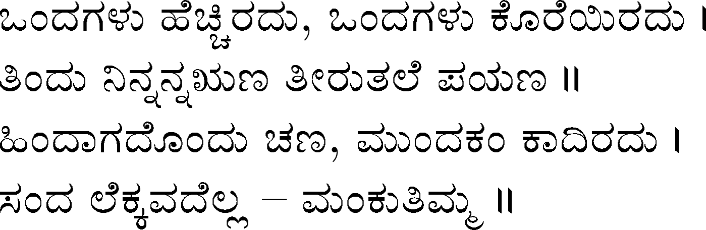 Being a fan of DVG's work, specifically of Kagga, I was then looking for an online resource to periodically review various verses. Not finding any and realizing that the support for rendering Kannada font in web browsers was minimal to non-existent, I combined the two projects - rendering LaTeX expressions as graphics and typesetting Kannada in LaTeX - to typeset, compile and produce all 945 verses as web-friendly PNG images over the next few years. The project was completed and the final verse, #945, was published on 29th August 2010. Sometime in early December 2020, the project files were restored from an old SVN repository into GitHub, higher resolution images were generate using tex2im (Python utility) and incorporated into my journal with originally published dates.