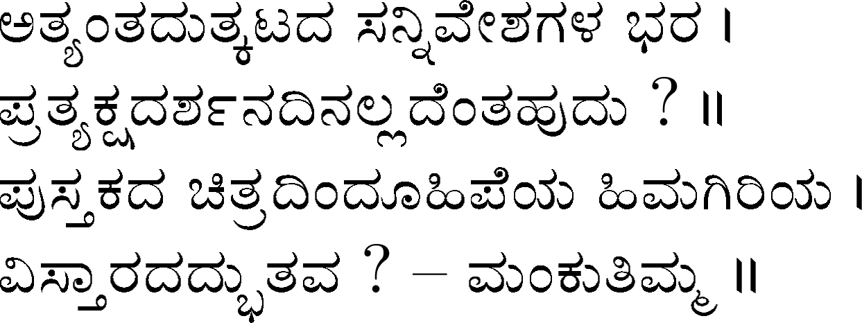 Devanahalli Venkataramanaiah Gundappa - better known as D V Gundappa or better yet just by his initials, DVG - was a writer and philosopher and a stalwart of Kannada (one of the south Indian languages) literature. While he authored numerous works - Antahpura Geete, Umarana Osage, Jnaapaka Chitra Shaale, Jeevana Dharma Yoga, MaruLa Muniyana Kagga, Samskruti, Vasanta Kusumaanjali and more, I believe that Mankutimmana Kagga (loose translation: Dim Tim's Rigmarole) stands out as being most familiar to the masses. Published in 1943, Mankutimmana Kagga (or just Kagga) is a collection of 945 standalone 4-line poems (i.e., muktaka) that conform to a specific grammar rule (i.e., aadipraasa - the second letter in every sentence of a given poem is the same or its variant). Their elegance and beauty, to me anyway, is that the scope of their meaning and one's understanding in turn seem to grow with one's experiences in life.
