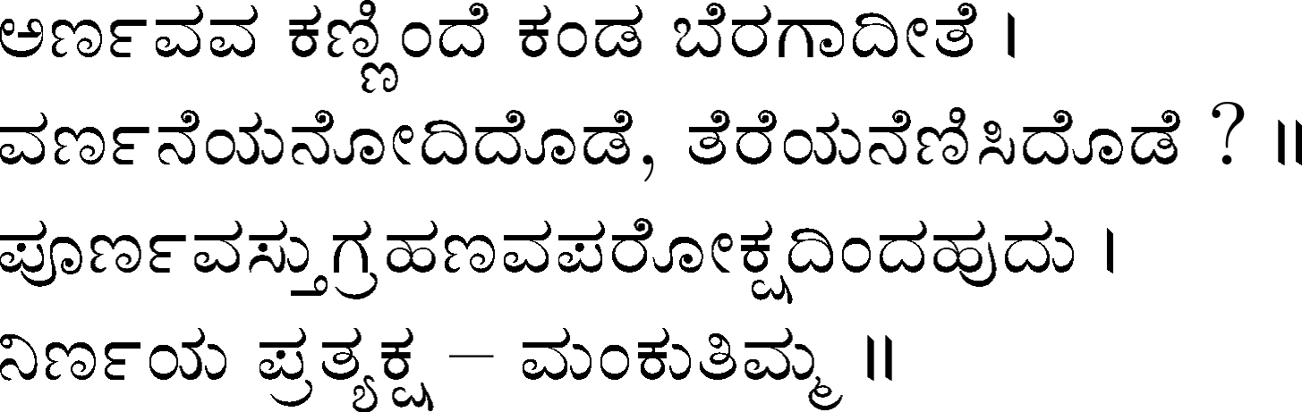 Devanahalli Venkataramanaiah Gundappa - better known as D V Gundappa or better yet just by his initials, DVG - was a writer and philosopher and a stalwart of Kannada (one of the south Indian languages) literature. While he authored numerous works - Antahpura Geete, Umarana Osage, Jnaapaka Chitra Shaale, Jeevana Dharma Yoga, MaruLa Muniyana Kagga, Samskruti, Vasanta Kusumaanjali and more, I believe that Mankutimmana Kagga (loose translation: Dim Tim's Rigmarole) stands out as being most familiar to the masses. Published in 1943, Mankutimmana Kagga (or just Kagga) is a collection of 945 standalone 4-line poems (i.e., muktaka) that conform to a specific grammar rule (i.e., aadipraasa - the second letter in every sentence of a given poem is the same or its variant). Their elegance and beauty, to me anyway, is that the scope of their meaning and one's understanding in turn seem to grow with one's experiences in life.