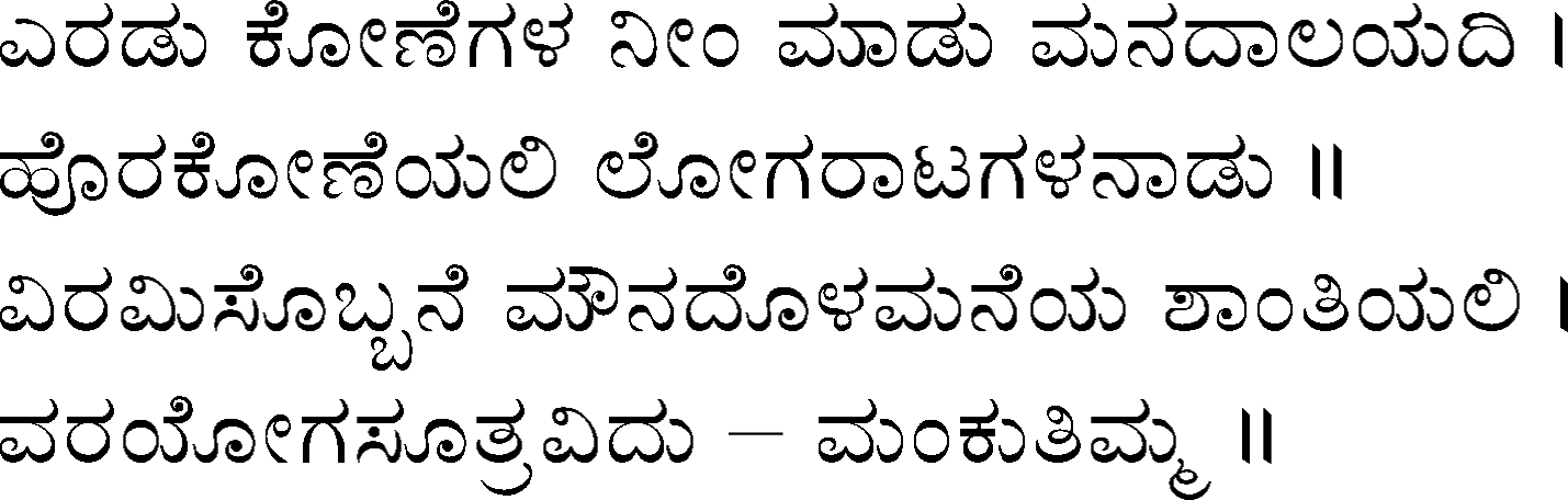 Devanahalli Venkataramanaiah Gundappa - better known as D V Gundappa or better yet just by his initials, DVG - was a writer and philosopher and a stalwart of Kannada (one of the south Indian languages) literature. While he authored numerous works - Antahpura Geete, Umarana Osage, Jnaapaka Chitra Shaale, Jeevana Dharma Yoga, MaruLa Muniyana Kagga, Samskruti, Vasanta Kusumaanjali and more, I believe that Mankutimmana Kagga (loose translation: Dim Tim's Rigmarole) stands out as being most familiar to the masses. Published in 1943, Mankutimmana Kagga (or just Kagga) is a collection of 945 standalone 4-line poems (i.e., muktaka) that conform to a specific grammar rule (i.e., aadipraasa - the second letter in every sentence of a given poem is the same or its variant). Their elegance and beauty, to me anyway, is that the scope of their meaning and one's understanding in turn seem to grow with one's experiences in life.