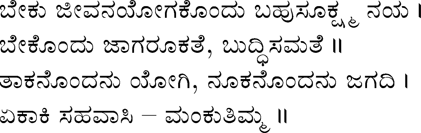 Devanahalli Venkataramanaiah Gundappa - better known as D V Gundappa or better yet just by his initials, DVG - was a writer and philosopher and a stalwart of Kannada (one of the south Indian languages) literature. While he authored numerous works - Antahpura Geete, Umarana Osage, Jnaapaka Chitra Shaale, Jeevana Dharma Yoga, MaruLa Muniyana Kagga, Samskruti, Vasanta Kusumaanjali and more, I believe that Mankutimmana Kagga (loose translation: Dim Tim's Rigmarole) stands out as being most familiar to the masses. Published in 1943, Mankutimmana Kagga (or just Kagga) is a collection of 945 standalone 4-line poems (i.e., muktaka) that conform to a specific grammar rule (i.e., aadipraasa - the second letter in every sentence of a given poem is the same or its variant). Their elegance and beauty, to me anyway, is that the scope of their meaning and one's understanding in turn seem to grow with one's experiences in life.