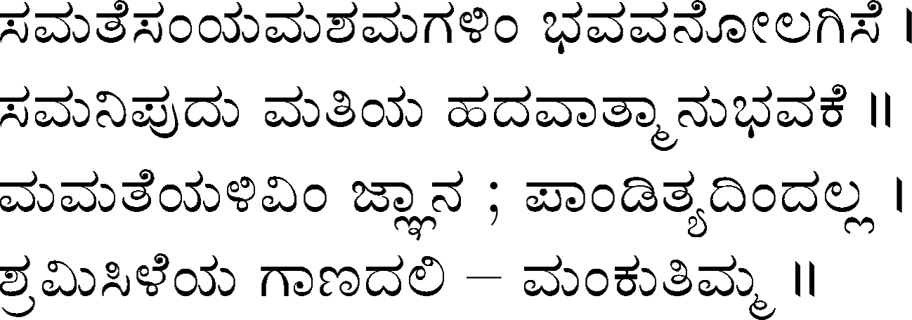 Devanahalli Venkataramanaiah Gundappa - better known as D V Gundappa or better yet just by his initials, DVG - was a writer and philosopher and a stalwart of Kannada (one of the south Indian languages) literature. While he authored numerous works - Antahpura Geete, Umarana Osage, Jnaapaka Chitra Shaale, Jeevana Dharma Yoga, MaruLa Muniyana Kagga, Samskruti, Vasanta Kusumaanjali and more, I believe that Mankutimmana Kagga (loose translation: Dim Tim's Rigmarole) stands out as being most familiar to the masses. Published in 1943, Mankutimmana Kagga (or just Kagga) is a collection of 945 standalone 4-line poems (i.e., muktaka) that conform to a specific grammar rule (i.e., aadipraasa - the second letter in every sentence of a given poem is the same or its variant). Their elegance and beauty, to me anyway, is that the scope of their meaning and one's understanding in turn seem to grow with one's experiences in life.