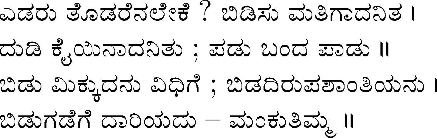 Devanahalli Venkataramanaiah Gundappa - better known as D V Gundappa or better yet just by his initials, DVG - was a writer and philosopher and a stalwart of Kannada (one of the south Indian languages) literature. While he authored numerous works - Antahpura Geete, Umarana Osage, Jnaapaka Chitra Shaale, Jeevana Dharma Yoga, MaruLa Muniyana Kagga, Samskruti, Vasanta Kusumaanjali and more, I believe that Mankutimmana Kagga (loose translation: Dim Tim's Rigmarole) stands out as being most familiar to the masses. Published in 1943, Mankutimmana Kagga (or just Kagga) is a collection of 945 standalone 4-line poems (i.e., muktaka) that conform to a specific grammar rule (i.e., aadipraasa - the second letter in every sentence of a given poem is the same or its variant). Their elegance and beauty, to me anyway, is that the scope of their meaning and one's understanding in turn seem to grow with one's experiences in life.