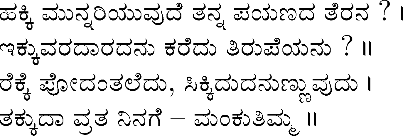 Devanahalli Venkataramanaiah Gundappa - better known as D V Gundappa or better yet just by his initials, DVG - was a writer and philosopher and a stalwart of Kannada (one of the south Indian languages) literature. While he authored numerous works - Antahpura Geete, Umarana Osage, Jnaapaka Chitra Shaale, Jeevana Dharma Yoga, MaruLa Muniyana Kagga, Samskruti, Vasanta Kusumaanjali and more, I believe that Mankutimmana Kagga (loose translation: Dim Tim's Rigmarole) stands out as being most familiar to the masses. Published in 1943, Mankutimmana Kagga (or just Kagga) is a collection of 945 standalone 4-line poems (i.e., muktaka) that conform to a specific grammar rule (i.e., aadipraasa - the second letter in every sentence of a given poem is the same or its variant). Their elegance and beauty, to me anyway, is that the scope of their meaning and one's understanding in turn seem to grow with one's experiences in life.