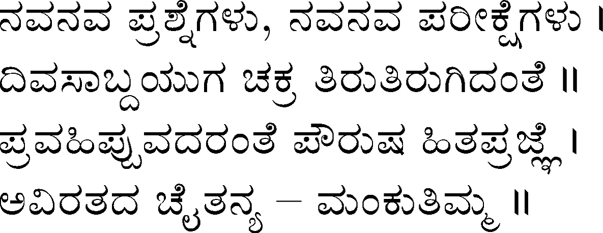 Being a fan of DVG's work, specifically of Kagga, I was then looking for an online resource to periodically review various verses. Not finding any and realizing that the support for rendering Kannada font in web browsers was minimal to non-existent, I combined the two projects - rendering LaTeX expressions as graphics and typesetting Kannada in LaTeX - to typeset, compile and produce all 945 verses as web-friendly PNG images over the next few years. The project was completed and the final verse, #945, was published on 29th August 2010. Sometime in early December 2020, the project files were restored from an old SVN repository into GitHub, higher resolution images were generate using tex2im (Python utility) and incorporated into my journal with originally published dates.