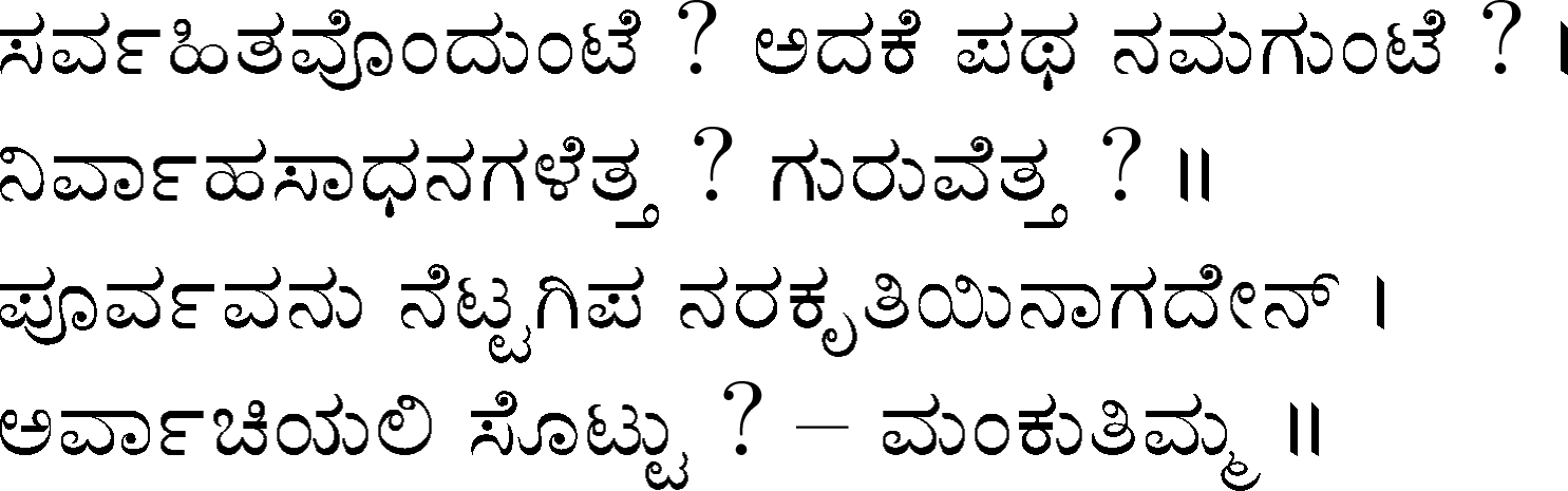 Devanahalli Venkataramanaiah Gundappa - better known as D V Gundappa or better yet just by his initials, DVG - was a writer and philosopher and a stalwart of Kannada (one of the south Indian languages) literature. While he authored numerous works - Antahpura Geete, Umarana Osage, Jnaapaka Chitra Shaale, Jeevana Dharma Yoga, MaruLa Muniyana Kagga, Samskruti, Vasanta Kusumaanjali and more, I believe that Mankutimmana Kagga (loose translation: Dim Tim's Rigmarole) stands out as being most familiar to the masses. Published in 1943, Mankutimmana Kagga (or just Kagga) is a collection of 945 standalone 4-line poems (i.e., muktaka) that conform to a specific grammar rule (i.e., aadipraasa - the second letter in every sentence of a given poem is the same or its variant). Their elegance and beauty, to me anyway, is that the scope of their meaning and one's understanding in turn seem to grow with one's experiences in life.