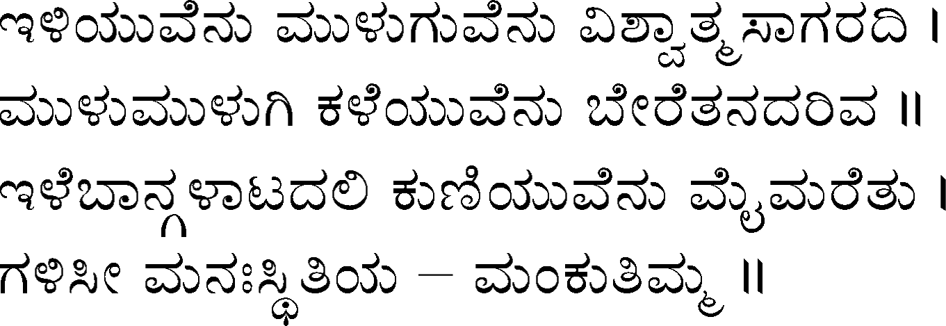 Devanahalli Venkataramanaiah Gundappa - better known as D V Gundappa or better yet just by his initials, DVG - was a writer and philosopher and a stalwart of Kannada (one of the south Indian languages) literature. While he authored numerous works - Antahpura Geete, Umarana Osage, Jnaapaka Chitra Shaale, Jeevana Dharma Yoga, MaruLa Muniyana Kagga, Samskruti, Vasanta Kusumaanjali and more, I believe that Mankutimmana Kagga (loose translation: Dim Tim's Rigmarole) stands out as being most familiar to the masses. Published in 1943, Mankutimmana Kagga (or just Kagga) is a collection of 945 standalone 4-line poems (i.e., muktaka) that conform to a specific grammar rule (i.e., aadipraasa - the second letter in every sentence of a given poem is the same or its variant). Their elegance and beauty, to me anyway, is that the scope of their meaning and one's understanding in turn seem to grow with one's experiences in life.