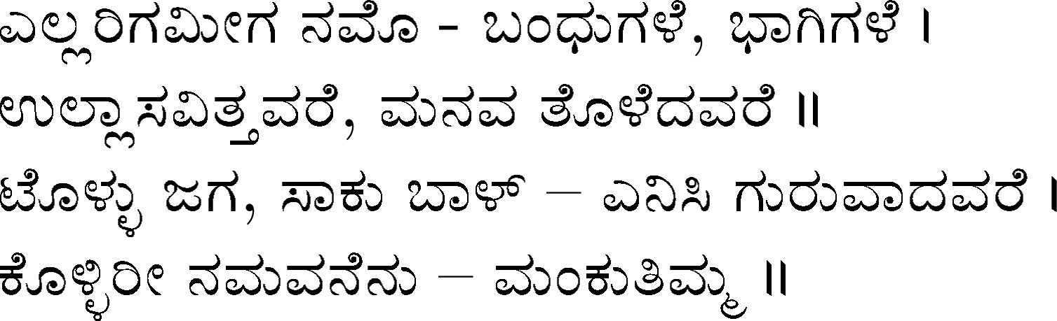 Being a fan of DVG's work, specifically of Kagga, I was then looking for an online resource to periodically review various verses. Not finding any and realizing that the support for rendering Kannada font in web browsers was minimal to non-existent, I combined the two projects - rendering LaTeX expressions as graphics and typesetting Kannada in LaTeX - to typeset, compile and produce all 945 verses as web-friendly PNG images over the next few years. The project was completed and the final verse, #945, was published on 29th August 2010. Sometime in early December 2020, the project files were restored from an old SVN repository into GitHub, higher resolution images were generate using tex2im (Python utility) and incorporated into my journal with originally published dates.