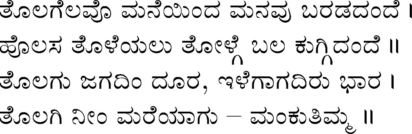 Devanahalli Venkataramanaiah Gundappa - better known as D V Gundappa or better yet just by his initials, DVG - was a writer and philosopher and a stalwart of Kannada (one of the south Indian languages) literature. While he authored numerous works - Antahpura Geete, Umarana Osage, Jnaapaka Chitra Shaale, Jeevana Dharma Yoga, MaruLa Muniyana Kagga, Samskruti, Vasanta Kusumaanjali and more, I believe that Mankutimmana Kagga (loose translation: Dim Tim's Rigmarole) stands out as being most familiar to the masses. Published in 1943, Mankutimmana Kagga (or just Kagga) is a collection of 945 standalone 4-line poems (i.e., muktaka) that conform to a specific grammar rule (i.e., aadipraasa - the second letter in every sentence of a given poem is the same or its variant). Their elegance and beauty, to me anyway, is that the scope of their meaning and one's understanding in turn seem to grow with one's experiences in life.