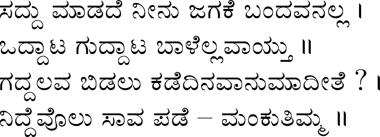 Devanahalli Venkataramanaiah Gundappa - better known as D V Gundappa or better yet just by his initials, DVG - was a writer and philosopher and a stalwart of Kannada (one of the south Indian languages) literature. While he authored numerous works - Antahpura Geete, Umarana Osage, Jnaapaka Chitra Shaale, Jeevana Dharma Yoga, MaruLa Muniyana Kagga, Samskruti, Vasanta Kusumaanjali and more, I believe that Mankutimmana Kagga (loose translation: Dim Tim's Rigmarole) stands out as being most familiar to the masses. Published in 1943, Mankutimmana Kagga (or just Kagga) is a collection of 945 standalone 4-line poems (i.e., muktaka) that conform to a specific grammar rule (i.e., aadipraasa - the second letter in every sentence of a given poem is the same or its variant). Their elegance and beauty, to me anyway, is that the scope of their meaning and one's understanding in turn seem to grow with one's experiences in life.