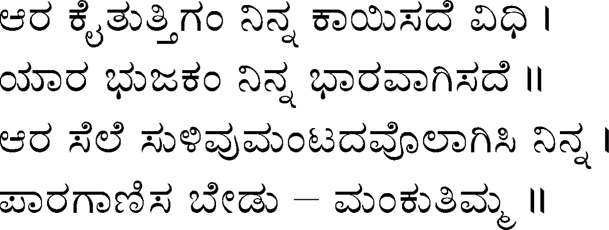 Devanahalli Venkataramanaiah Gundappa - better known as D V Gundappa or better yet just by his initials, DVG - was a writer and philosopher and a stalwart of Kannada (one of the south Indian languages) literature. While he authored numerous works - Antahpura Geete, Umarana Osage, Jnaapaka Chitra Shaale, Jeevana Dharma Yoga, MaruLa Muniyana Kagga, Samskruti, Vasanta Kusumaanjali and more, I believe that Mankutimmana Kagga (loose translation: Dim Tim's Rigmarole) stands out as being most familiar to the masses. Published in 1943, Mankutimmana Kagga (or just Kagga) is a collection of 945 standalone 4-line poems (i.e., muktaka) that conform to a specific grammar rule (i.e., aadipraasa - the second letter in every sentence of a given poem is the same or its variant). Their elegance and beauty, to me anyway, is that the scope of their meaning and one's understanding in turn seem to grow with one's experiences in life.