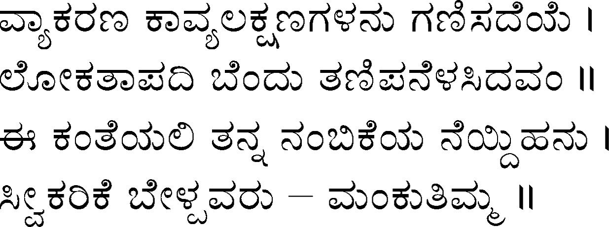 Devanahalli Venkataramanaiah Gundappa - better known as D V Gundappa or better yet just by his initials, DVG - was a writer and philosopher and a stalwart of Kannada (one of the south Indian languages) literature. While he authored numerous works - Antahpura Geete, Umarana Osage, Jnaapaka Chitra Shaale, Jeevana Dharma Yoga, MaruLa Muniyana Kagga, Samskruti, Vasanta Kusumaanjali and more, I believe that Mankutimmana Kagga (loose translation: Dim Tim's Rigmarole) stands out as being most familiar to the masses. Published in 1943, Mankutimmana Kagga (or just Kagga) is a collection of 945 standalone 4-line poems (i.e., muktaka) that conform to a specific grammar rule (i.e., aadipraasa - the second letter in every sentence of a given poem is the same or its variant). Their elegance and beauty, to me anyway, is that the scope of their meaning and one's understanding in turn seem to grow with one's experiences in life.